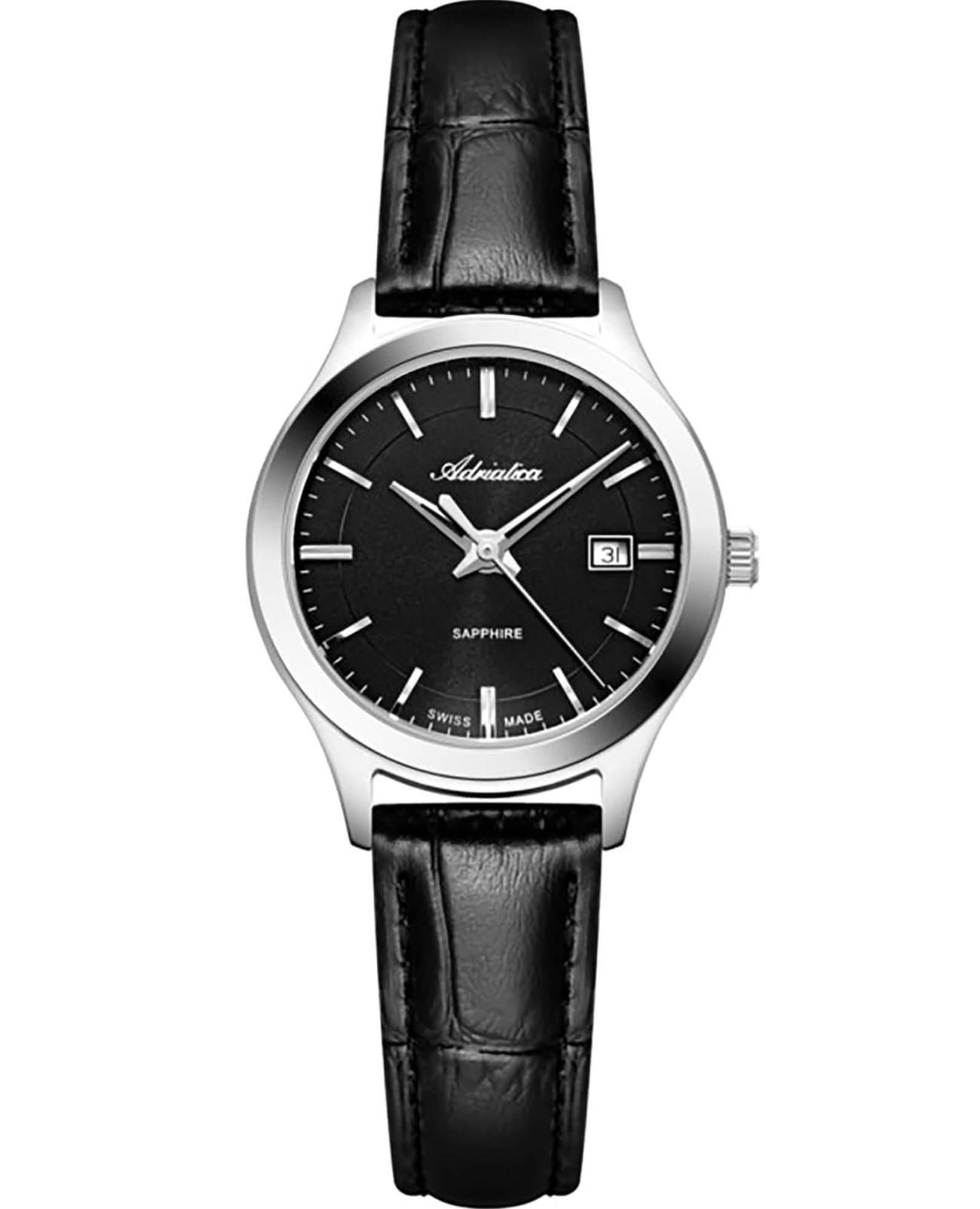 Женские швейцарские часы Adriatica Classic A3195.5214Q имеют кварцевый механизм с высокой точностью. Корпус часов изготовлен из нержавеющей стали. Сапфировое стеклоСапфировое стеклоПрочный и надёжный материал из кристалла сапфира синтетического происхождения, характеризующийся особой твёрдостью и устойчивостью к царапинам и повреждениям. устойчивое к появлению царапин, обладающее высокой прозрачностью, защищает черный циферблат, на котором расположилось окошко даты в районе 3 часа. Кожаный черный ремешок со стандартной застежкой обеспечивает комфортное ношение и подчеркивает стильный внешний вид. Надежный кварцевый механизм с калибром RONDA 785 гарантирует точность времени, а водозащита 50 метров, что позволит защитить корпус от случайных брызг или капель дождя.