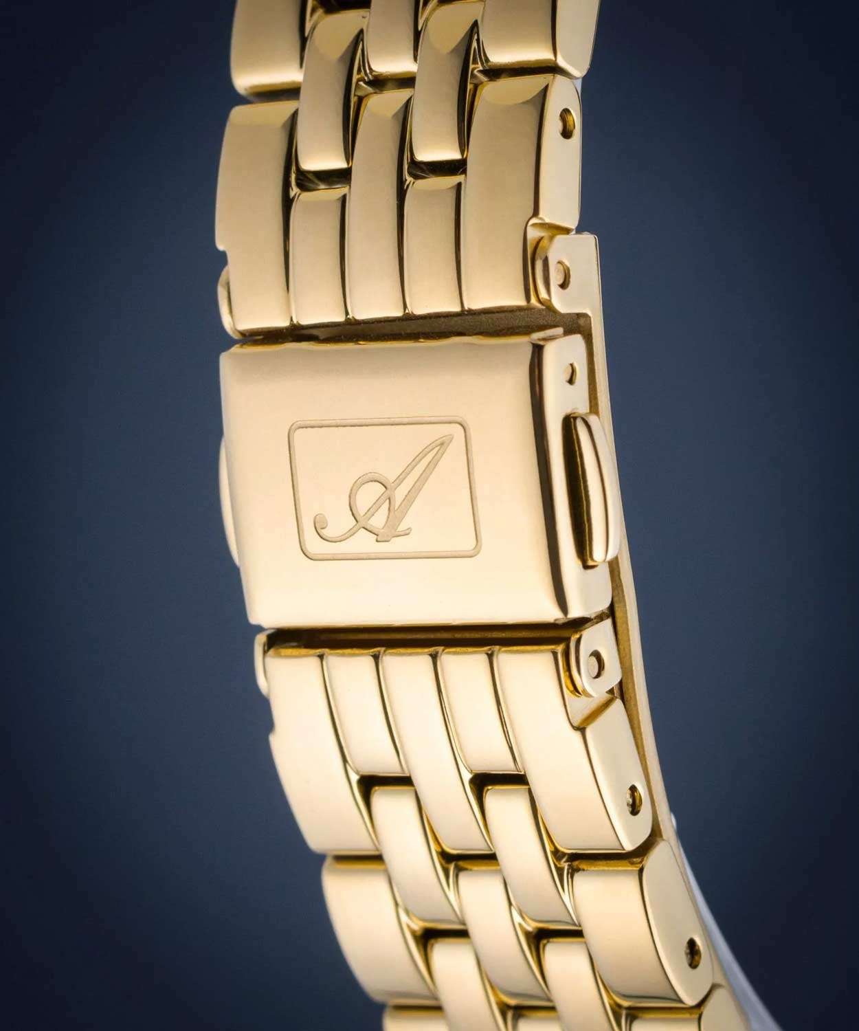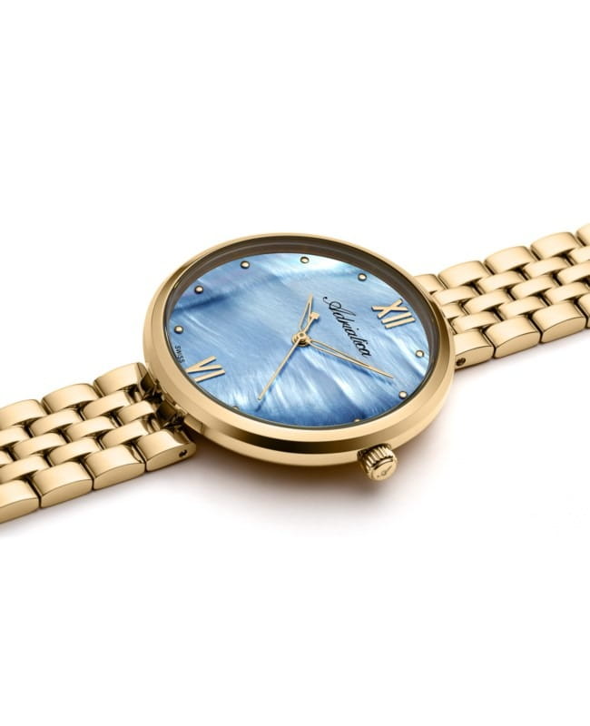 Женские часы Adriatica Essence A3760.118WQ имеют кварцевый механизм с высокой точностью. Минеральное стеклоМинеральное стеклоМинеральное стекло представляет собой искусственно выращенный минерал кварца. Такое стекло отличается особой устойчивостью к повреждениям и царапинам. Уступает по некоторым качествам сапфировому стеклу. обеспечивает надежную защиту перламутрового синего циферблата, на котором расположились метки в виде точек и римские цифры VI и XII. Корпус часов изготовлен из нержавеющей стали с золотистым PVDPVDУльтратонкое покрытие наносится в технике вакуумного напыления, сочетает в себе нитрид титана особой прочности со слоем золота или оксида хрома. Несёт в себе декоративную или защитную функцию. покрытием, что придает часам утонченный и стильный вид. Браслет из нержавеющей стали с золотистым PVDPVDУльтратонкое покрытие наносится в технике вакуумного напыления, сочетает в себе нитрид титана особой прочности со слоем золота или оксида хрома. Несёт в себе декоративную или защитную функцию. покрытием и раскладной застёжкойРаскладная застёжкаТакой тип застёжки используется только на браслетах из металла. Она никогда не раскрывается полностью, происходит разделение на 2 и более частей. Раскладывающая застёжка снизит вероятность потери часов к минимуму., гармонично дополняет общий дизайн и обеспечивает комфортное ношение на запястье. Надежный кварцевый механизм с калибром RONDA 763 гарантирует точность времени, а водозащита WR 30 (3 ATM) делает эти часы практичным выбором для повседневного использования.