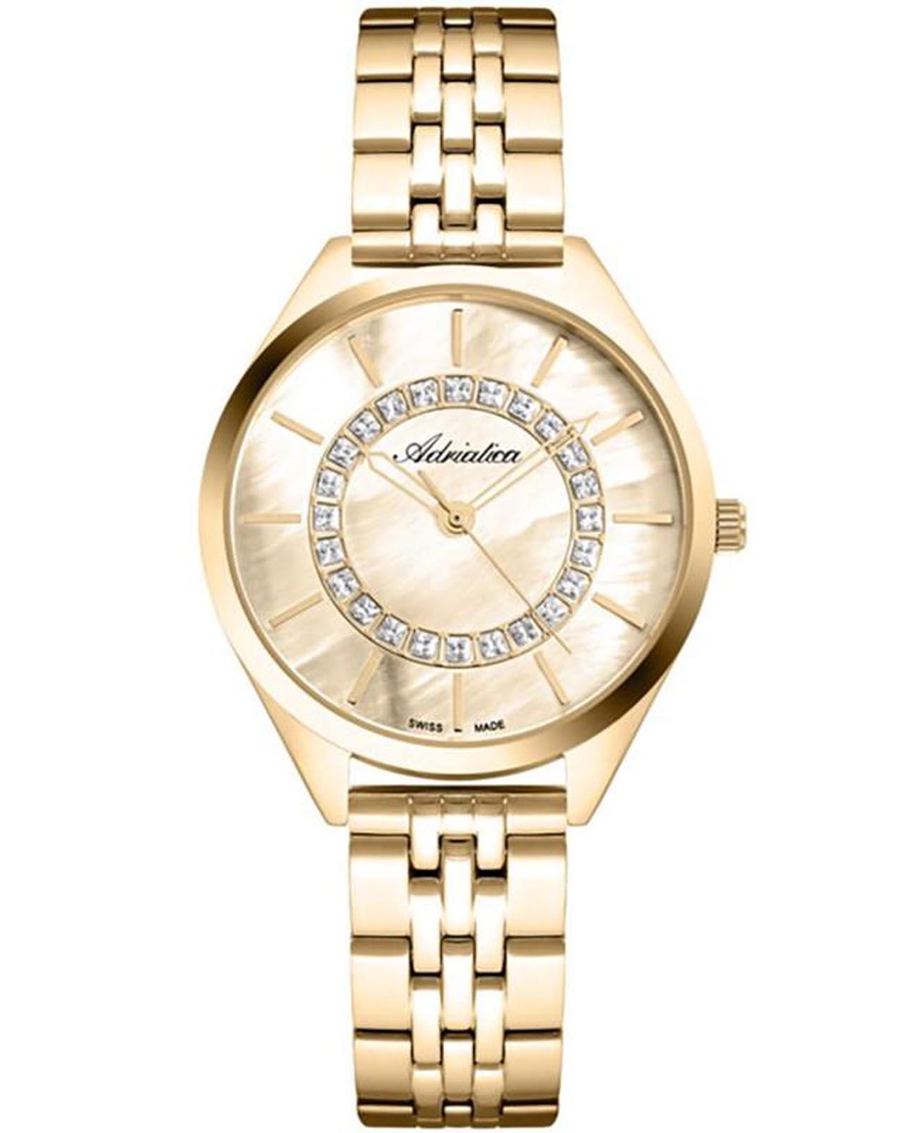 Женские часы с минеральным стекломМинеральное стеклоМинеральное стекло представляет собой искусственно выращенный минерал кварца. Такое стекло отличается особой устойчивостью к повреждениям и царапинам. Уступает по некоторым качествам сапфировому стеклу. Adriatica A3817.111SQ, кварцевый механизм Ronda 783, работающим от батарейки с высокой точностью. Класс водозащиты: 30 метров, позволит защитить корпус от случайных брызг или капель дождя. Корпус часов изготовлен из стали  с IP-покрытиемIP-покрытиеМетод ионного напыления. Демонстрирует повышенную устойчивость к истиранию, окислению и химическим веществам. Под воздействием высокого давления и температуры около 1500°C молекулы металла надёжно соединяются с частицами корпуса часов..Стальной браслет на раскладной застёжкеРаскладная застёжкаТакой тип застёжки используется только на браслетах из металла. Она никогда не раскрывается полностью, происходит разделение на 2 и более частей. Раскладывающая застёжка снизит вероятность потери часов к минимуму.  с IP-покрытиемIP-покрытиеМетод ионного напыления. Демонстрирует повышенную устойчивость к истиранию, окислению и химическим веществам. Под воздействием высокого давления и температуры около 1500°C молекулы металла надёжно соединяются с частицами корпуса часов..