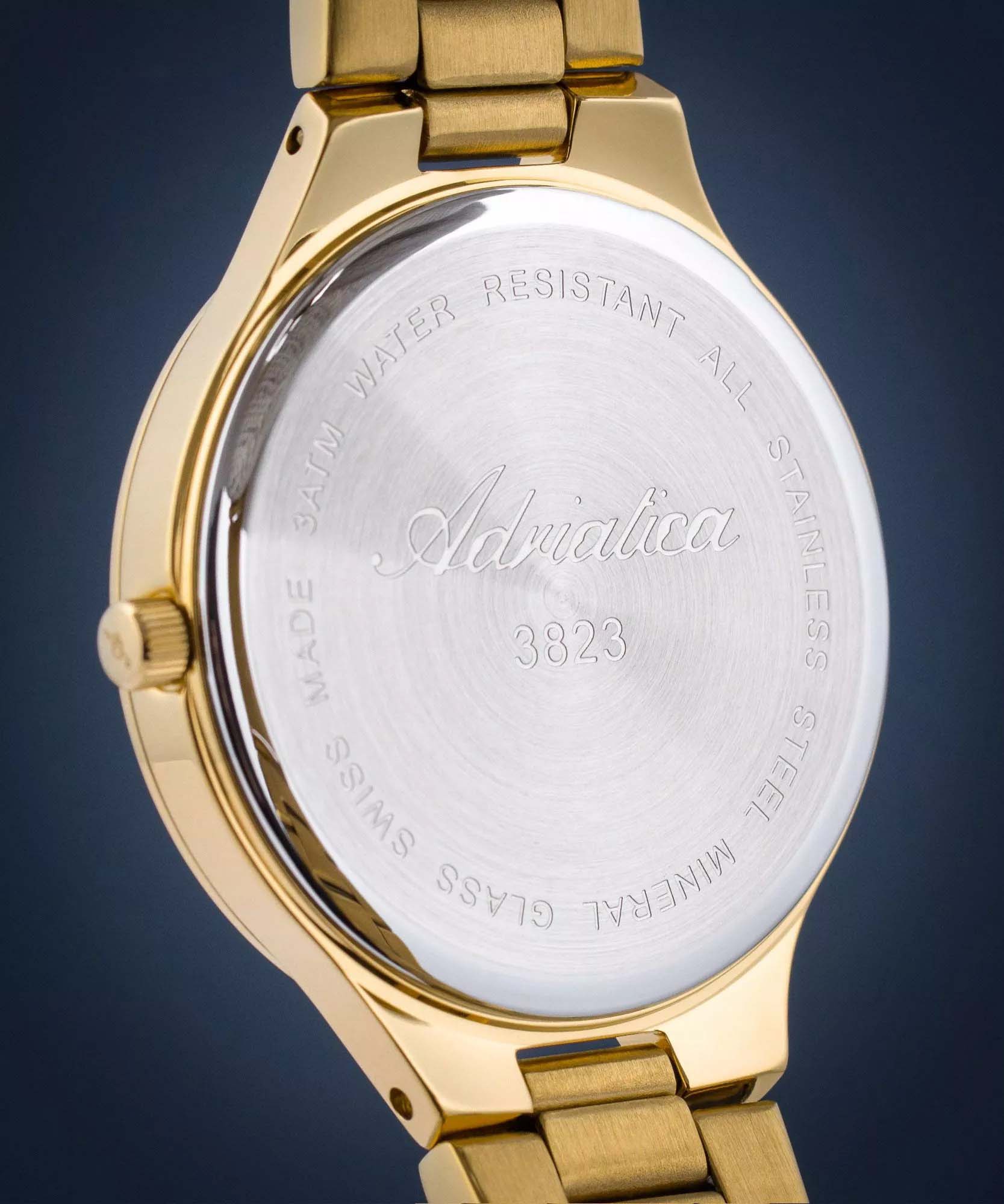 Женские кварцевые часы Adriatica A3823.1163Q — это элегантный аксессуар швейцарского производства с корпусом круглой формы, выполненным из нержавеющей стали с PVD-покрытиемPVDУльтратонкое покрытие наносится в технике вакуумного напыления, сочетает в себе нитрид титана особой прочности со слоем золота или оксида хрома. Несёт в себе декоративную или защитную функцию. в цвете жёлтое золото. Циферблат серебристого цвета оформлен с эффектом «солнечных лучей» (Sunray), дополнен центральной секундной стрелкой. Защиту обеспечивает минеральное стеклоМинеральное стеклоМинеральное стекло представляет собой искусственно выращенный минерал кварца. Такое стекло отличается особой устойчивостью к повреждениям и царапинам. Уступает по некоторым качествам сапфировому стеклу.. Браслет из нержавеющей стали с PVD-покрытиемPVDУльтратонкое покрытие наносится в технике вакуумного напыления, сочетает в себе нитрид титана особой прочности со слоем золота или оксида хрома. Несёт в себе декоративную или защитную функцию. фиксируется на раскладной застёжкеРаскладная застёжкаТакой тип застёжки используется только на браслетах из металла. Она никогда не раскрывается полностью, происходит разделение на 2 и более частей. Раскладывающая застёжка снизит вероятность потери часов к минимуму.. Водонепроницаемость 30 метров, позволит защитить корпус от случайных брызг или капель дождя.