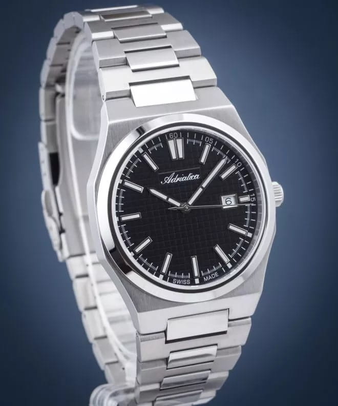 Часы Adriatica A8326.5114Q воплощают в себе элегантность и функциональность, идеально подходящие для современных мужчин, ценящих швейцарское качество. Их черный циферблат защищенный сапфировым стекломСапфировое стеклоПрочный и надёжный материал из кристалла сапфира синтетического происхождения, характеризующийся особой твёрдостью и устойчивостью к царапинам и повреждениям., заключен в корпус из нержавеющей стали диаметром 40 мм и толщиной 10 мм. Надежный кварцевый механизм с калибром ETA F06 обеспечивает высокую точность, а водозащита 5 ATM делает часы устойчивыми к воздействию воды. Стальной браслет с раскладной застёжкойРаскладная застёжкаТакой тип застёжки используется только на браслетах из металла. Она никогда не раскрывается полностью, происходит разделение на 2 и более частей. Раскладывающая застёжка снизит вероятность потери часов к минимуму. обеспечивает комфортное и надежное ношение. Часы оснащены функцией отображения даты в окошке в положении 3 часа, что добавляет практичности в повседневной жизни. Люминесцентное покрытиеЛюминесцентное покрытиеПозволяет считывать показания времени в темноте. Производители наносят на стрелки, часовые индексы, безель или поверхность циферблата светонакопительный состав, дающий холодное свечение. на стрелках и метках обеспечивает отличную видимость в темноте.