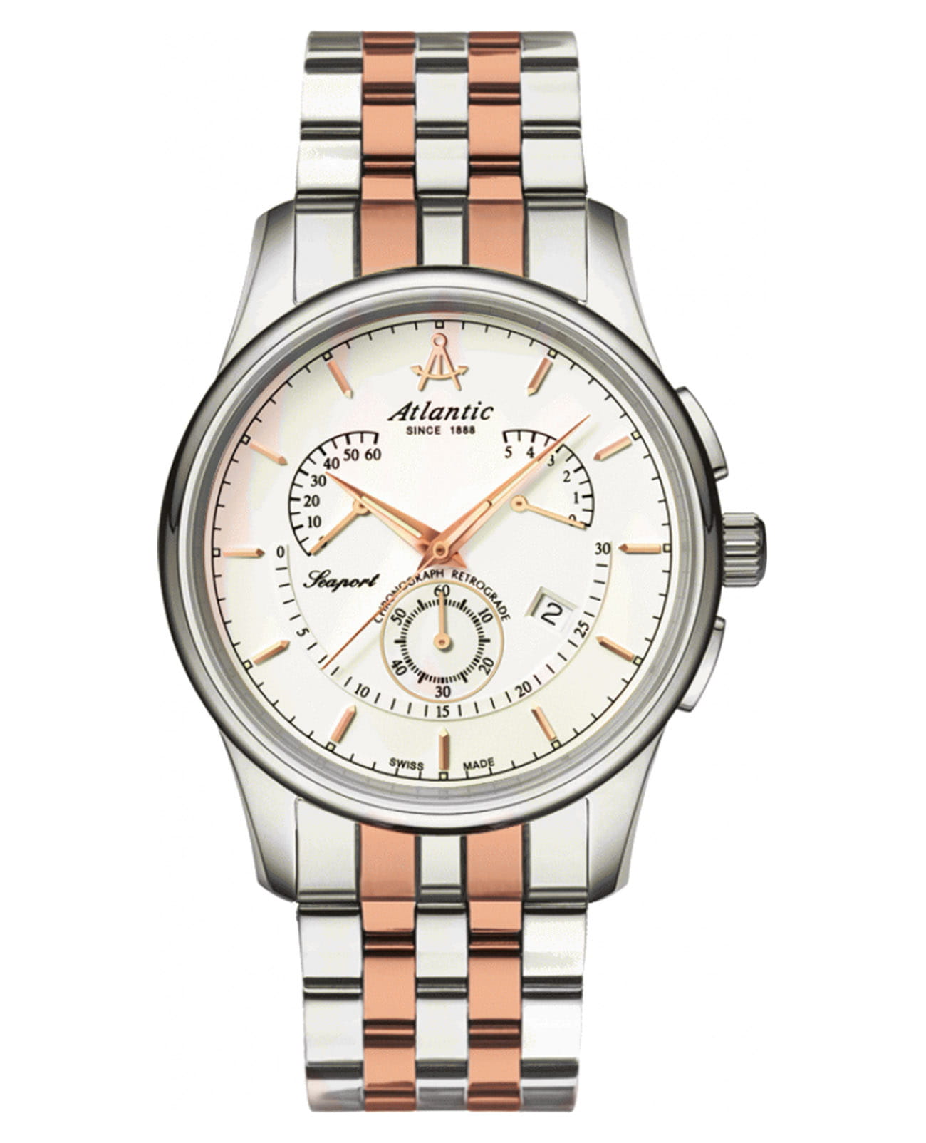 Мужские швейцарские часы-хронографХронографФункция позволяет измерять отрезки времени с особой точностью: часы, минуты, секунды. Верным признаком хронографа является наличие на циферблате 3 дополнительных окошек-счётчиков. Atlantic Seaport 56455.43.21R, кварцевый механизм с высокой точностью.  Cапфировое стеклоСапфировое стеклоПрочный и надёжный материал из кристалла сапфира синтетического происхождения, характеризующийся особой твёрдостью и устойчивостью к царапинам и повреждениям. устойчивое к появлению царапин и обладающее высокой прозрачностью. Корпус и браслет часов изготовлены из нержавеющей стали. На циферблате расположены три дополнительных индикатора, окошко даты находится в положении 4 часов. Стрелки с люминесцентным покрытиемЛюминесцентное покрытиеПозволяет считывать показания времени в темноте. Производители наносят на стрелки, часовые индексы, безель или поверхность циферблата светонакопительный состав, дающий холодное свечение.. Класс водозащиты: 50 метров, позволит защитить корпус от случайных брызг или капель дождя. Стальной браслет с частичным  PVDPVDУльтратонкое покрытие наносится в технике вакуумного напыления, сочетает в себе нитрид титана особой прочности со слоем золота или оксида хрома. Несёт в себе декоративную или защитную функцию. покрытием на раскладной застёжкеРаскладная застёжкаТакой тип застёжки используется только на браслетах из металла. Она никогда не раскрывается полностью, происходит разделение на 2 и более частей. Раскладывающая застёжка снизит вероятность потери часов к минимуму..