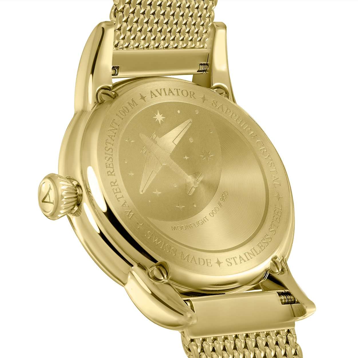 Aviator V.1.33.1.344.5 “Douglas Moonflight” — элегантный дамский швейцарский Moonphase с утончённой авиационной эстетикой. Корпус 36 мм из нержавеющей стали с PVD-покрытиемPVDУльтратонкое покрытие наносится в технике вакуумного напыления, сочетает в себе нитрид титана особой прочности со слоем золота или оксида хрома. Несёт в себе декоративную или защитную функцию. с полированной отделкой обладает компактными пропорциями и удобным литым профилем.