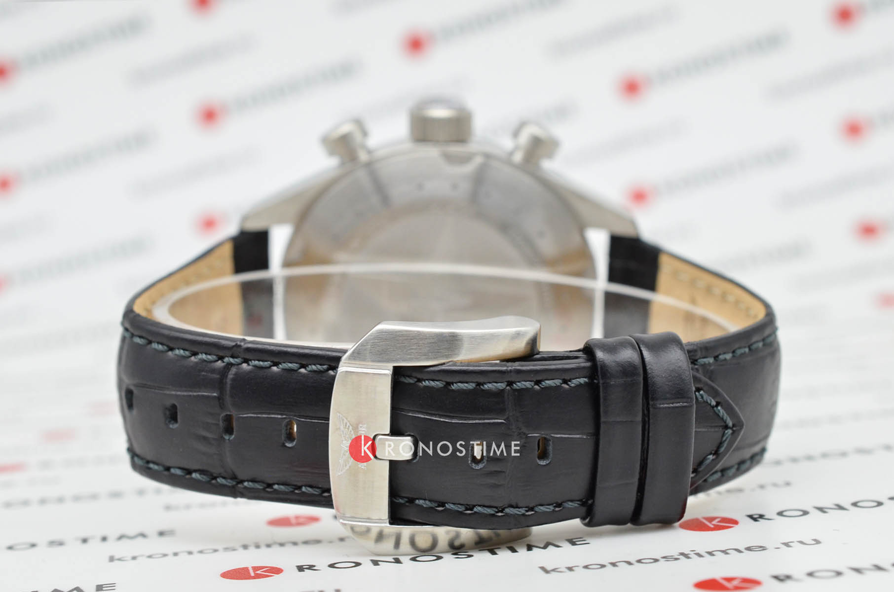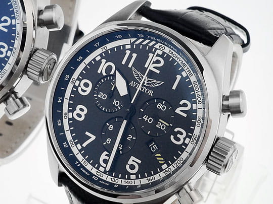 Aviator Airacobra V.2.25.0.169.4 — швейцарский GMT-хронограф в духе пилотских инструментов, объединяющий точность, удобство и лаконичный дизайн. Диаметр корпуса — 45 мм, выполнен из нержавеющей стали, что подчёркивает техническую надёжность в образе часов.