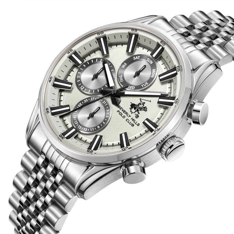 BEVERLY HILLS POLO CLUB BP3823X.360 — стильные мужские часы, сочетающие спортивную динамику и функциональность. Крупный корпус выполнен из нержавеющей стали серебристого цвета, диаметром 42,5 мм, гармонично дополнен стальным браслетом на раскладной застёжкеРаскладная застёжкаТакой тип застёжки используется только на браслетах из металла. Она никогда не раскрывается полностью, происходит разделение на 2 и более частей. Раскладывающая застёжка снизит вероятность потери часов к минимуму., что обеспечивает комфортное ношение. Минеральное стеклоМинеральное стеклоМинеральное стекло представляет собой искусственно выращенный минерал кварца. Такое стекло отличается особой устойчивостью к повреждениям и царапинам. Уступает по некоторым качествам сапфировому стеклу. с сапфировым покрытием защищает циферблат от царапин, а кварцевый механизм обеспечивает высокую точность. Благодаря своей универсальной эстетике эти часы уместны и в деловой среде, и в повседневном образе. Стрелки и метки с люминесцентным покрытиемЛюминесцентное покрытиеПозволяет считывать показания времени в темноте. Производители наносят на стрелки, часовые индексы, безель или поверхность циферблата светонакопительный состав, дающий холодное свечение., обеспечивающим хорошую читаемость в темноте. Указатель дня недели вынесен на отдельный циферблат, также присутствует индикация 24-часового формата времени. Идеальный выбор для тех, кто ценит элегантный дизайн и качество. Водозащита до 50 метров позволит защитить корпус от случайных брызг или капель дождя.