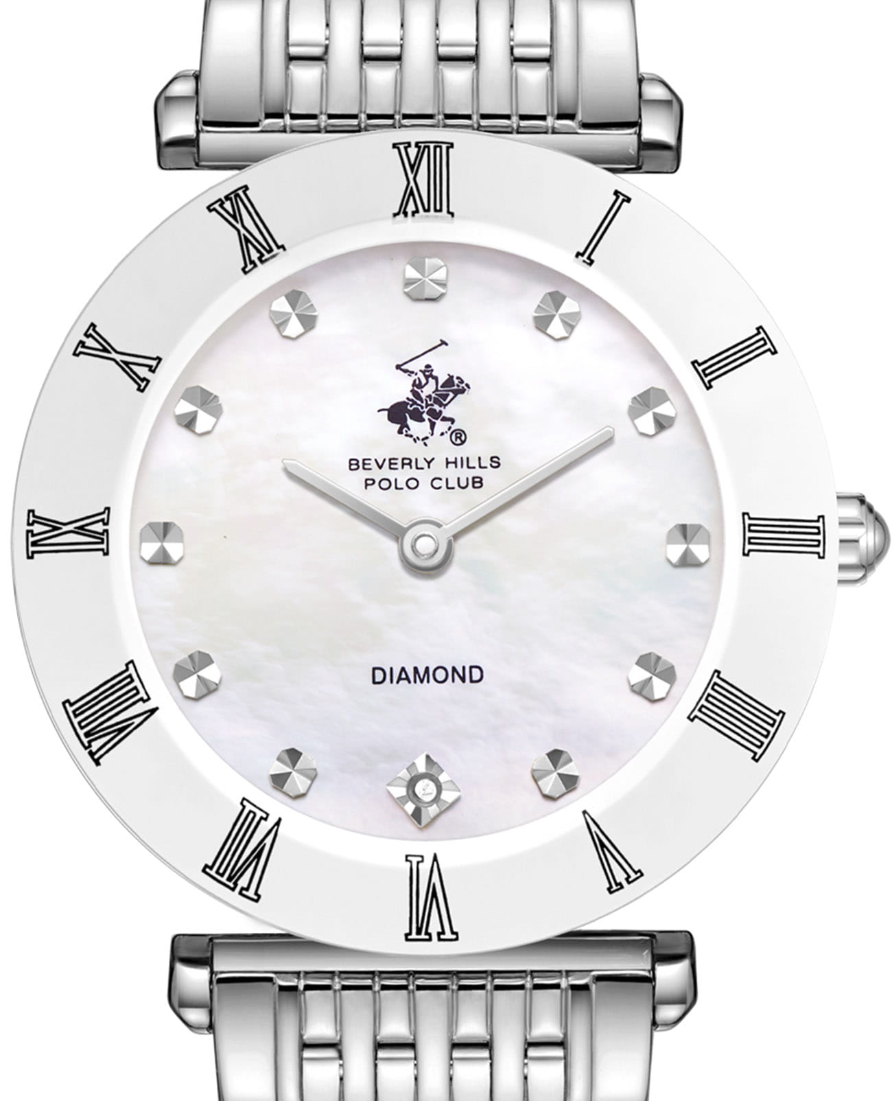 Женские кварцевые часы Beverly Hills Polo Club — это символ элегантного стиля и безупречного вкуса. Корпус диаметром 30 мм выполнен из суперметалла. БезельБезельВнешний ободок, закрепляющий стекло. В спортивных часах так называется поворотное кольцо с делениями на циферблате, выполняет роль таймера – замеряет отрезки времени на шкале. Неподвижный безель – элемент декора. Однонаправленно вращающийся безель на дайверских часах позволяет фиксировать моменты погружения и выныривания на поверхность. из суперметалла с IP-покрытиемIP-покрытиеМетод ионного напыления. Демонстрирует повышенную устойчивость к истиранию, окислению и химическим веществам. Под воздействием высокого давления и температуры около 1500°C молекулы металла надёжно соединяются с частицами корпуса часов.. Циферблат перламутрового цвета оформлен римскими цифрами, стрелками и инкрустирован одним синтетическим бриллиантом. Циферблат защищён минеральным стекломМинеральное стеклоМинеральное стекло представляет собой искусственно выращенный минерал кварца. Такое стекло отличается особой устойчивостью к повреждениям и царапинам. Уступает по некоторым качествам сапфировому стеклу. с сапфировым покрытием. Часы оснащены стальным браслетом на застёжке «бабочка» с кнопкамиЗастёжка "бабочка"Такой вид застёжки дополняется предохранителями, помогающими избежать случайного раскрытия браслета. Обладают изящным исполнением. . Водонепроницаемость 30 м позволяет использовать часы в повседневных условиях. Идеальный выбор для тех, кто ценит американское качество и универсальный дизайн.