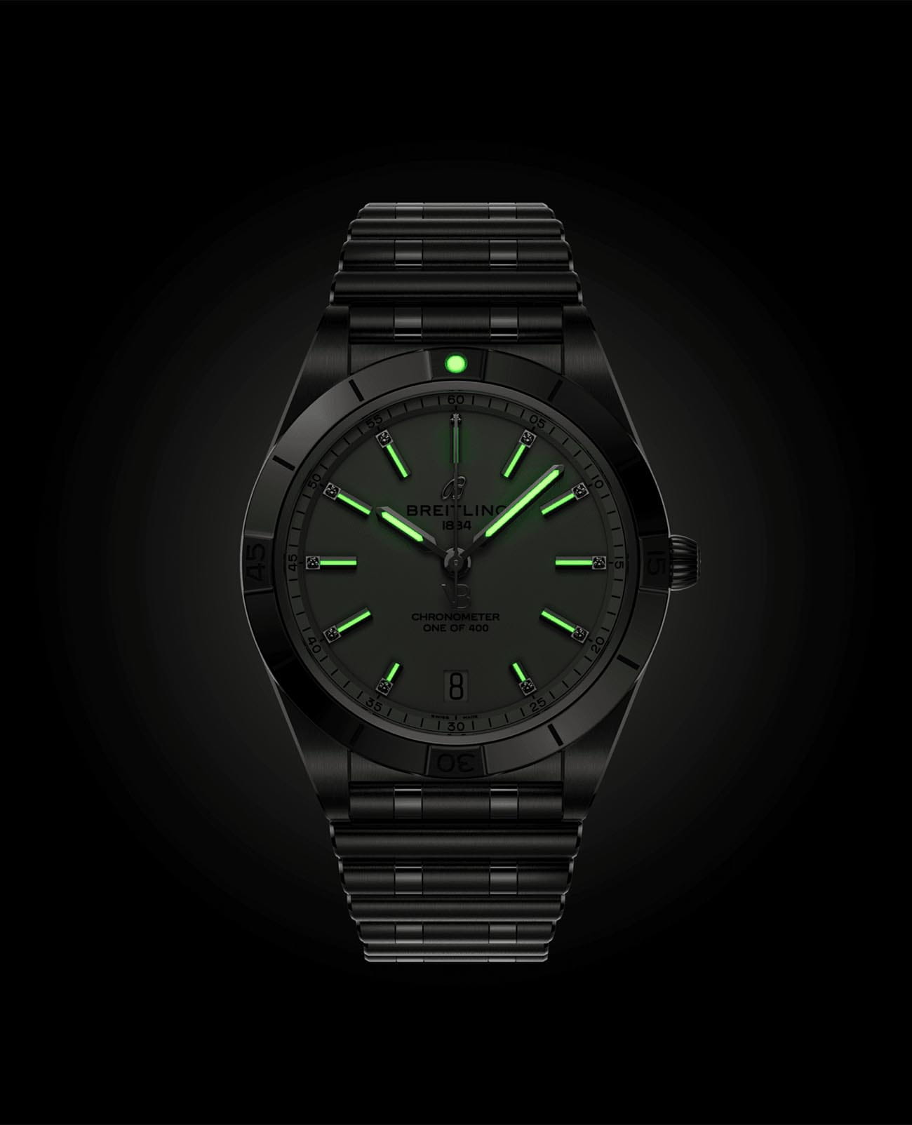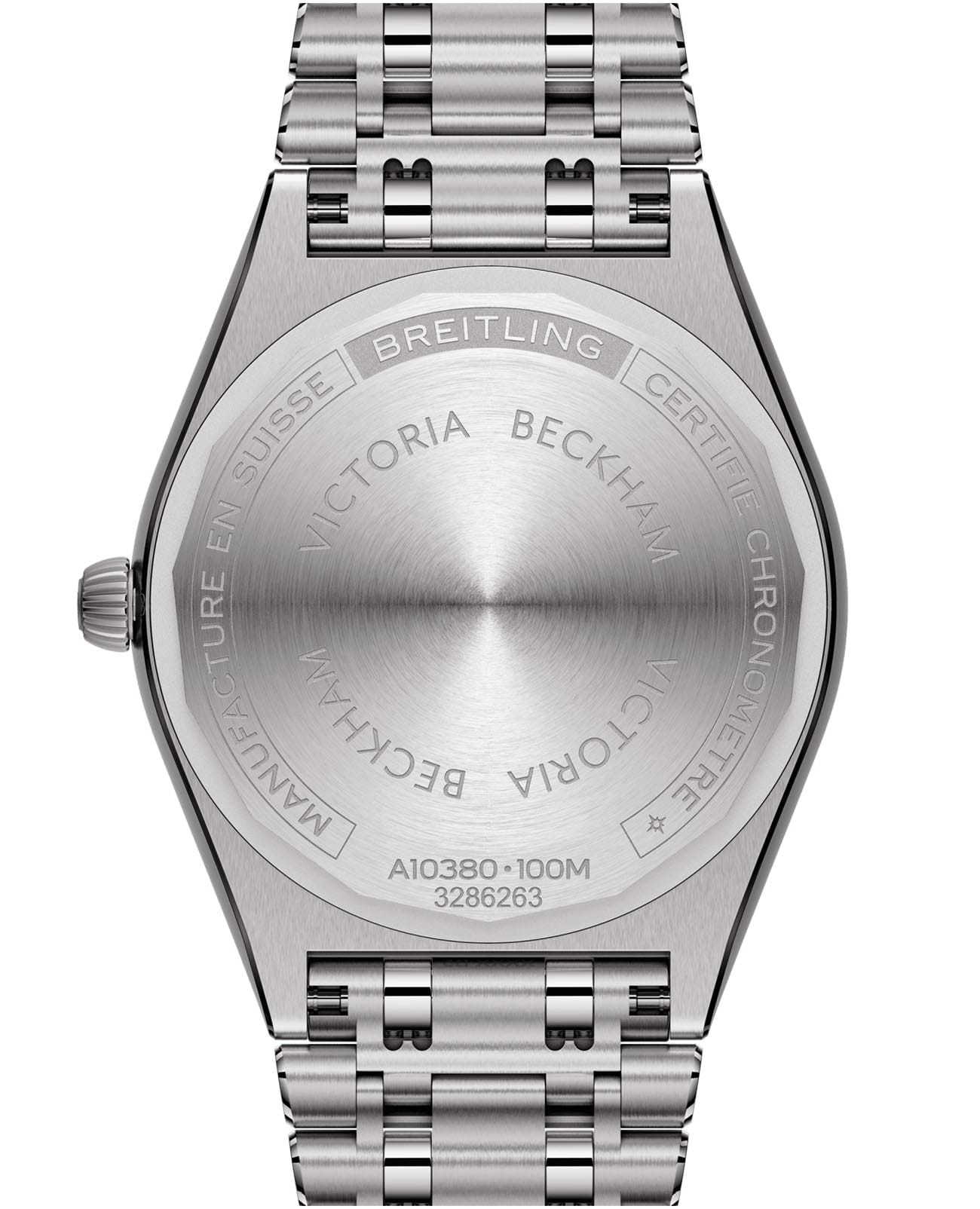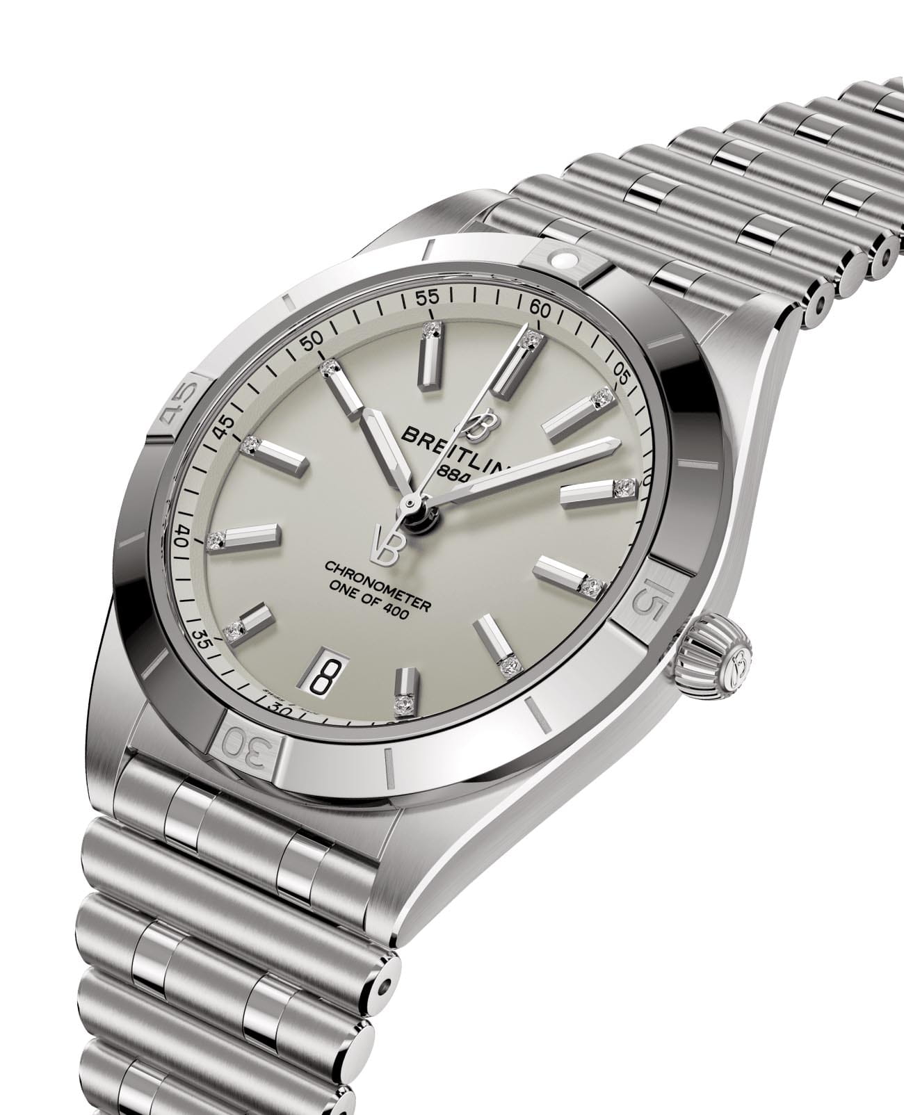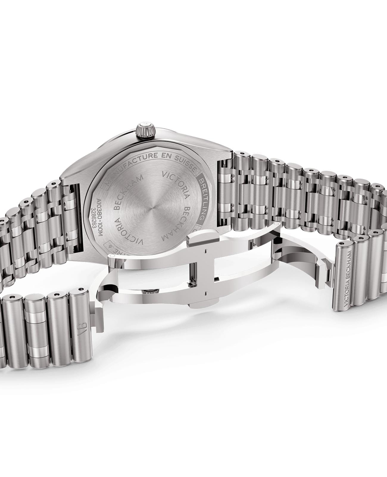 Женские швейцарские часы Breitling Chronomat Automatic 36 Victoria Beckham A103801A1G1A1 с надёжным автоматическим механизмом, выпущенные лимитированной серией всего из 1500 экземпляров в сотрудничестве с модным домом Victoria Beckham. Сапфировое стеклоСапфировое стеклоПрочный и надёжный материал из кристалла сапфира синтетического происхождения, характеризующийся особой твёрдостью и устойчивостью к царапинам и повреждениям. устойчивое к мелким механическим повреждениям. Корпус и браслет часов изготовлены из нержавеющей стали. Стальной браслет на застёжке-бабочке с кнопкамиЗастёжка "бабочка"Такой вид застёжки дополняется предохранителями, помогающими избежать случайного раскрытия браслета. Обладают изящным исполнением. . Стрелки и метки с люминесцентным покрытиемЛюминесцентное покрытиеПозволяет считывать показания времени в темноте. Производители наносят на стрелки, часовые индексы, безель или поверхность циферблата светонакопительный состав, дающий холодное свечение.. Класс водозащиты: 100 метров, позволит плавать, нырять и заниматься другими водными видами спорта. Окошко даты находится в положении 6 часов. Циферблат инкрустирован бриллиантами.