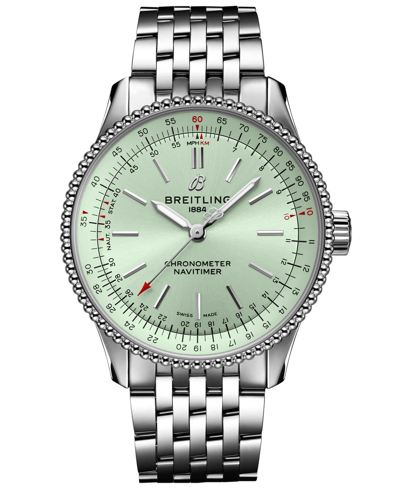 Женские швейцарские часы-хронометр Breitling Navitimer Automatic 35 A17395361L1A1, механический механизм (автоматический калибр) с высокой точностью. Сапфировое стеклоСапфировое стеклоПрочный и надёжный материал из кристалла сапфира синтетического происхождения, характеризующийся особой твёрдостью и устойчивостью к царапинам и повреждениям. устойчивое к появлению царапин, обладающее высокой прозрачностью. Класс водозащиты: 30 метров, позволит защитить корпус от случайных брызг или капель дождя. Корпус часов изготовлен из стали. Стальной браслет с застёжкой-бабочкой с кнопкамиЗастёжка "бабочка"Такой вид застёжки дополняется предохранителями, помогающими избежать случайного раскрытия браслета. Обладают изящным исполнением. . Шкала тахиметраТахиметрРазмеченная шкала, располагается на ободке или безеле часов. Тахиметр позволяет рассчитать скорость на определённом участке пути, расстояние измеряется в километрах или милях. на циферблате. Окошко даты находится в положении 6 часов. Стрелки и метки с люминесцентным покрытиемЛюминесцентное покрытиеПозволяет считывать показания времени в темноте. Производители наносят на стрелки, часовые индексы, безель или поверхность циферблата светонакопительный состав, дающий холодное свечение..