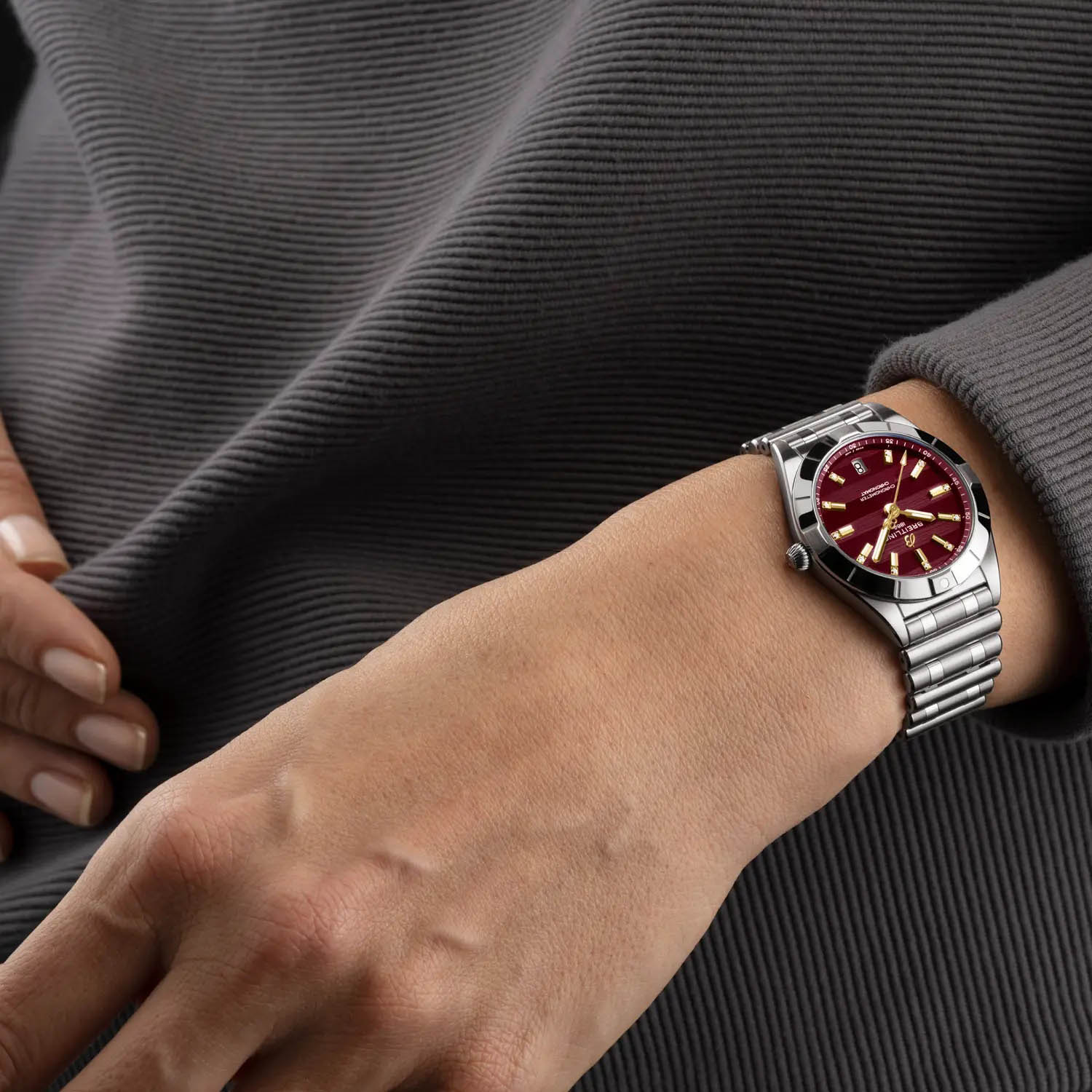 Женские кварцевые часы Breitling Chronomat 32 A773108A1K1A1 — это изысканный аксессуар, сочетающий в себе классический дизайн и современные технологии. Модель выполнена из нержавеющей стали с диаметром корпуса 32 мм и толщиной 8,54 мм, что делает её утончённой и лаконичной. Циферблат бордового цвета дополнен 11 бриллиантами круглой огранки, придающими модели роскошный внешний вид. Защиту механизма обеспечивает сапфировое стеклоСапфировое стеклоПрочный и надёжный материал из кристалла сапфира синтетического происхождения, характеризующийся особой твёрдостью и устойчивостью к царапинам и повреждениям. с антибликовым покрытиемАнтибликовое покрытиеСлой оксида металла в 0,13-0,3 микрон, благодаря которому стекло часов не бликует и не отражает свет. Антибликовое покрытие уменьшает отражение света в 10 раз, обеспечивая отличную читаемость показателей циферблата., устойчивым к повреждениям. Браслет из нержавеющей стали оснащён застёжкой «бабочка» с кнопкамиЗастёжка "бабочка"Такой вид застёжки дополняется предохранителями, помогающими избежать случайного раскрытия браслета. Обладают изящным исполнением. , обеспечивающей комфорт и надёжную фиксацию на запястье. Часы оснащены кварцевым механизмом Breitling 77, обеспечивающим точную работу и минимальное обслуживание. Водонепроницаемость позволяет использовать модель при плавании и других водных активностях без глубокого погружения. На задней крышке выгравирован логотип спортивной команды, которой посвящена модель, и надпись «Один из 75». Это лимитированная серия, выпущенная всего 75 экземпляров, что подчёркивает её уникальность. Гарантия 2 года подтверждает качество и долговечность изделия. Эти часы станут универсальным аксессуаром для тех, кто ценит сочетание стиля, функциональности и швейцарского мастерства — идеальный выбор для повседневной носки и торжественных случаев.