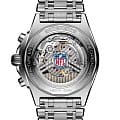 Мужские швейцарские часы-хронограф с секундомером Breitling Chronomat B01 42 NFL Las Vegas Raiders Edition AB01342B1B1A1, механический механизм (автоматический калибр) с высокой точностью. Сапфировое стеклоСапфировое стеклоПрочный и надёжный материал из кристалла сапфира синтетического происхождения, характеризующийся особой твёрдостью и устойчивостью к царапинам и повреждениям. устойчивое к появлению царапин, обладающее высокой прозрачностью. Класс водозащиты: 200 метров, позволит плавать, нырять и заниматься другими водными видами спорта. Корпус часов изготовлен из нержавеющей стали. Стальной браслет на застёжке «бабочка» с кнопкамиЗастёжка "бабочка"Такой вид застёжки дополняется предохранителями, помогающими избежать случайного раскрытия браслета. Обладают изящным исполнением. . Стрелки и метки с люминесцентным покрытиемЛюминесцентное покрытиеПозволяет считывать показания времени в темноте. Производители наносят на стрелки, часовые индексы, безель или поверхность циферблата светонакопительный состав, дающий холодное свечение.. Шкала тахиметра на циферблате. Окошко даты находится в положении 6 часов.