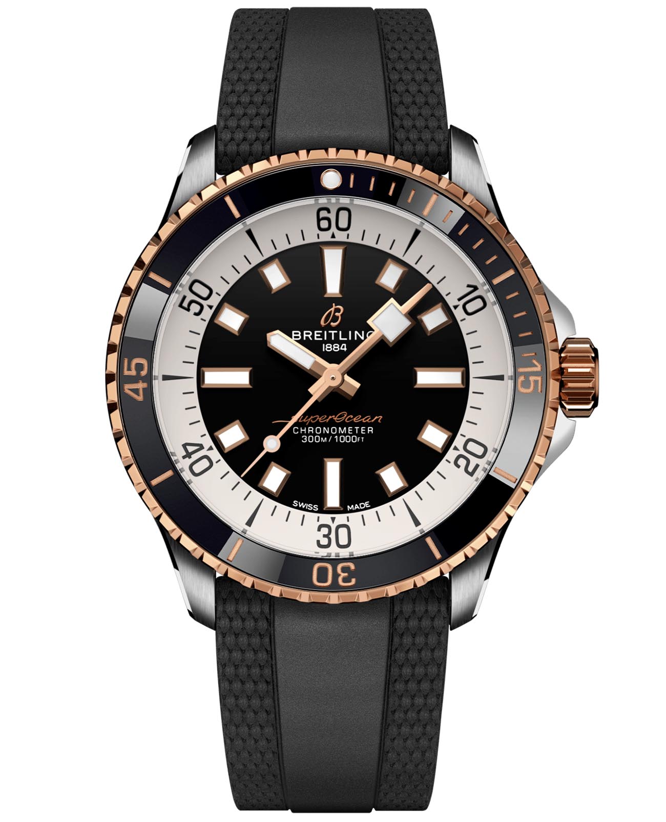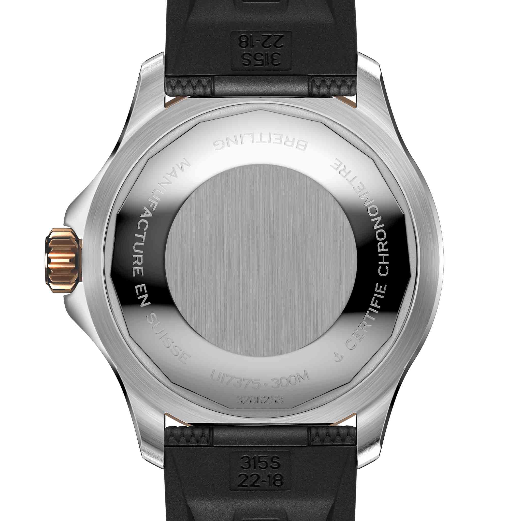 Мужские водонепроницаемые швейцарские часы Breitling Superocean Automatic 42 U17375211B1S1, механический механизм (автоматический калибр) с высокой точностью. Сапфировое стеклоСапфировое стеклоПрочный и надёжный материал из кристалла сапфира синтетического происхождения, характеризующийся особой твёрдостью и устойчивостью к царапинам и повреждениям. устойчивое к появлению царапин, обладающее высокой прозрачностью. Класс водозащиты: 300 метров, позволит плавать, нырять и заниматься другими водными видами спорта. Корпус часов изготовлен из стали и 18-каратного красного золота. Силиконовый ремешок с раскладной застёжкойРаскладная застёжкаТакой тип застёжки используется только на браслетах из металла. Она никогда не раскрывается полностью, происходит разделение на 2 и более частей. Раскладывающая застёжка снизит вероятность потери часов к минимуму.. Стрелки и метки с люминесцентным покрытиемЛюминесцентное покрытиеПозволяет считывать показания времени в темноте. Производители наносят на стрелки, часовые индексы, безель или поверхность циферблата светонакопительный состав, дающий холодное свечение.. Широкие стрелки и индексы с люминесцентным покрытиемЛюминесцентное покрытиеПозволяет считывать показания времени в темноте. Производители наносят на стрелки, часовые индексы, безель или поверхность циферблата светонакопительный состав, дающий холодное свечение. обеспечивают легкую читаемость под водой. Вращающийся стальной безельБезельВнешний ободок, закрепляющий стекло. В спортивных часах так называется поворотное кольцо с делениями на циферблате, выполняет роль таймера – замеряет отрезки времени на шкале. Неподвижный безель – элемент декора. Однонаправленно вращающийся безель на дайверских часах позволяет фиксировать моменты погружения и выныривания на поверхность. с люминесцентным покрытиемЛюминесцентное покрытиеПозволяет считывать показания времени в темноте. Производители наносят на стрелки, часовые индексы, безель или поверхность циферблата светонакопительный состав, дающий холодное свечение. Superluminova из нержавеющей стали и керамики, защищенный от царапин, никогда не изнашивается и не выцветает.