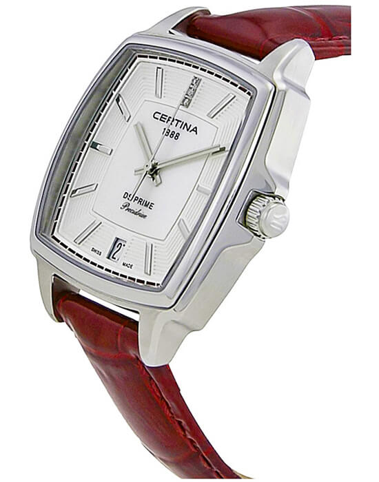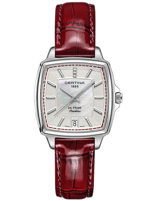 Аксессуар с квадратным корпусом украшен 3 бриллиантами на метке 12 часов. Ярко-красный ремешок из натуральной кожи всегда актуален. Высокую точность хода обеспечивает швейцарский кварцевый механизм ETA F06.411 Precidrive™Precidrive™Инновационный кварцевый механизм Certina. Часы, оснащённые этим швейцарским калибром, приравниваются к точности к сертифицированным хронометрам, точность хода составляет +/-10 секунд в год.. Стекло из сапфира с обработкой "антиблик". Отображение числа.