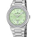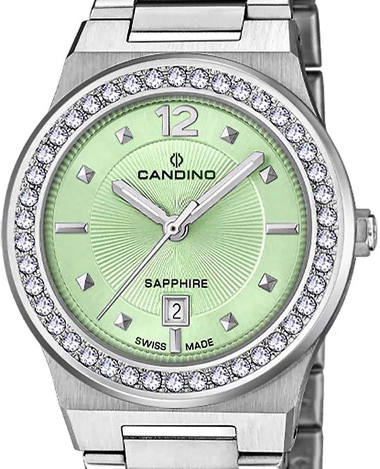 Женские кварцевые часы Candino из коллекции Lady Elegance — это элегантный аксессуар швейцарского производства, сочетающий изысканный дизайн и надёжность. Корпус круглой формы выполнен из стали серебряного цвета и защищён сапфировым стекломСапфировое стеклоПрочный и надёжный материал из кристалла сапфира синтетического происхождения, характеризующийся особой твёрдостью и устойчивостью к царапинам и повреждениям.. Безель украшен кристаллами, подчёркивая роскошь модели. Циферблат зелёного цвета оформлен точками в качестве индикации, окошко даты расположено на отметке 6 часов. Стрелки и метки оснащены люминесцентным покрытиемЛюминесцентное покрытиеПозволяет считывать показания времени в темноте. Производители наносят на стрелки, часовые индексы, безель или поверхность циферблата светонакопительный состав, дающий холодное свечение. Luminova, обеспечивающим хорошую читаемость в темноте. Браслет из стали серебряного цвета фиксируется на раскладной застёжкеРаскладная застёжкаТакой тип застёжки используется только на браслетах из металла. Она никогда не раскрывается полностью, происходит разделение на 2 и более частей. Раскладывающая застёжка снизит вероятность потери часов к минимуму.. Водонепроницаемость составляет 50 WR, что позволяет использовать часы в повседневных условиях, защищая от случайных брызг и капель дождя. Модель идеально подходит для повседневного ношения, подчёркивая утончённый стиль и женственность.