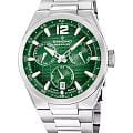 Мужские кварцевые часы Candino — это сочетание классического дизайна, надёжности и швейцарского качества. Корпус диаметром 43 мм и толщиной 11,5 мм выполнен из нержавеющей стали. Циферблат зелёного цвета оформлен индексами в виде штрихов и стрелками. Указатели дня недели и даты расположены в центре циферблата. Стрелки и метки с люминесцентным покрытиемЛюминесцентное покрытиеПозволяет считывать показания времени в темноте. Производители наносят на стрелки, часовые индексы, безель или поверхность циферблата светонакопительный состав, дающий холодное свечение., обеспечивающим хорошую читаемость в темноте. Циферблат защищён сапфировым стекломСапфировое стеклоПрочный и надёжный материал из кристалла сапфира синтетического происхождения, характеризующийся особой твёрдостью и устойчивостью к царапинам и повреждениям., устойчивым к царапинам. Механизм — кварцевый произведённый в Швейцарии. Часы оснащены стальным браслетом с раскладной застёжкойРаскладная застёжкаТакой тип застёжки используется только на браслетах из металла. Она никогда не раскрывается полностью, происходит разделение на 2 и более частей. Раскладывающая застёжка снизит вероятность потери часов к минимуму.. Водонепроницаемость 100 м позволяет использовать часы для плавания и повседневного ношения. Гарантия — 2 года. Идеальный выбор для тех, кто ценит стиль, функциональность и точность.
