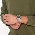 Гладкая серебристая поверхность плавно отображает падающий свет. Есть записная книжка с возможностью сохранения до 30 контактов. Время отображается в 2 форматах - в 12- и 24-часовом. Дисплей освещается светодиодной подсветкойСветодиодная подсветкаСветодиодная или LED-подсветка обеспечивает появление яркого холодного свечения за счёт LED-элементов - маленьких лампочек. Они потребляют минимальное количество энергии, чаще всего можно встретить 1 светодиод, в нижней части циферблата.. Встроена опция мирового времениМировое время Полезное часовое усложнение, отображающее время в основных городах и известных областях по всему миру, оно связано с часовыми поясами, удобно для путешественников и бизнесменов. . Водонепроницаемость в 100 WR.
