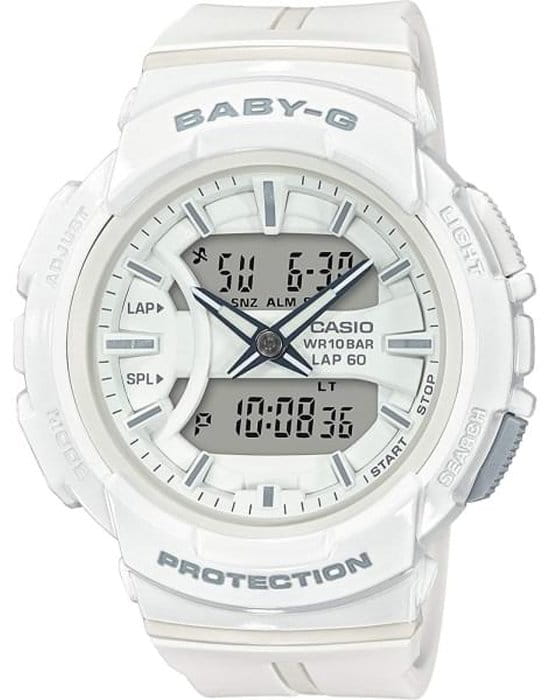 Модель из серии BGA-240 в лаконичном белом корпусе с серыми деталями циферблата. Данная серия позиционируется Casio как часы для любителей бега: благодаря функции Lap Memory 60™ вы сможете хранить в часах до 60 записей с информацией о дате ваших пробежек и показателей времени круга, что поможет вам совершенствоваться и улучшать свои беговые показатели.
