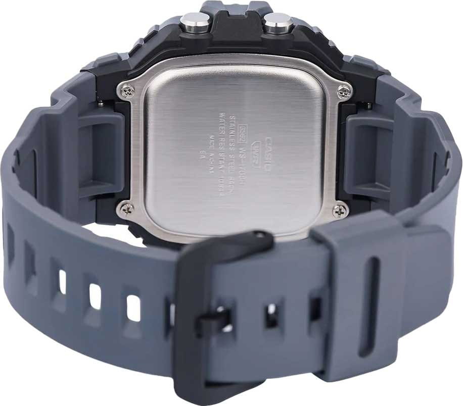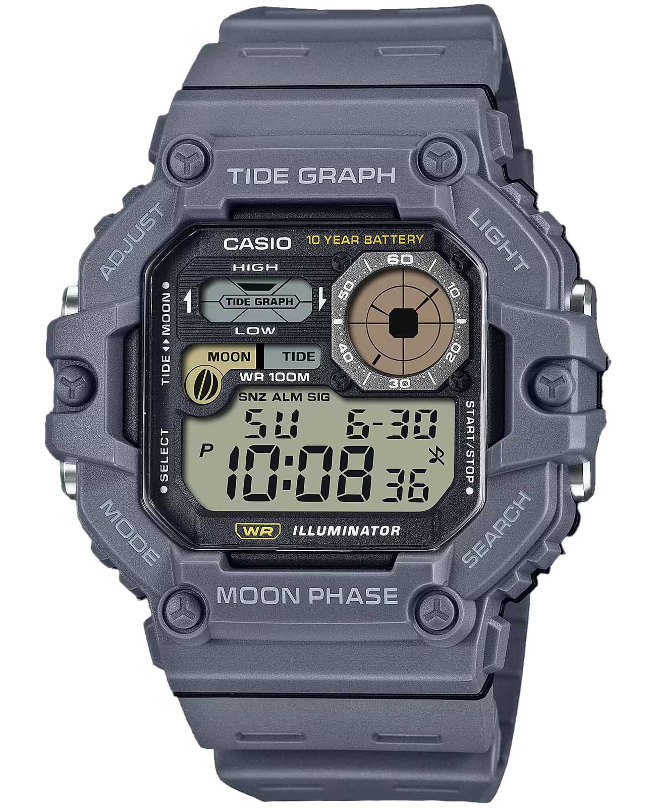 Многофункциональные часы Casio WS-1700H-8A с секундомеромСекундомерСекундоме́р — прибор, способный измерять интервалы времени с точностью до долей секунды. и таймеромТаймерОтсчитывает секунды в обратном направлении в заданном интервале времени. отлично подойдут для занятий спортом. Часы выдерживают давление до 10 АТМ и имеют впечатляющий срок службы батареи — около 10 лет. Используется батарея CR2025. Кварцевый механизм с высокой точностью. Модель оснащена двойным временем, секундомером с точностью до 1/100 секунды, таймером и мульти-будильником. Органическое стекло. Класс водозащиты: 100 метров, позволит плавать, нырять и заниматься другими водными видами спорта. Корпус из пластика. На ЖК-экране отображаются не только время и дата, но и дополнительная информация, такая как график приливов и отливов, данные о фазах Луны и аналоговое время. Добавлена светодиодная подсветкаСветодиодная подсветкаСветодиодная или LED-подсветка обеспечивает появление яркого холодного свечения за счёт LED-элементов - маленьких лампочек. Они потребляют минимальное количество энергии, чаще всего можно встретить 1 светодиод, в нижней части циферблата. янтарного цвета для улучшения видимости в темноте. Силикованный ремень с классической застежкой.