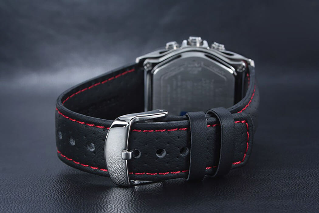 Стильный аксессуар имеет необычный дизайн в футуристическом стиле, присутствуют контрастные элементы. Выдержана общая автомобильная тематика, такое исполнение сохраняет актуальность уже много сезонов подряд. Модель станет идеальным вариантом для путешественников и спортсменов благодаря часовым усложнениям: термометр, мировое времяМировое время Полезное часовое усложнение, отображающее время в основных городах и известных областях по всему миру, оно связано с часовыми поясами, удобно для путешественников и бизнесменов. , секундомер, таймер, календарь, будильник. Память на 50 кругов - позволяет измерять время тренировки. Выпуклое минеральное стекло. Водостойкость 100 метров. Корпус из нержавеющей стали 316L. Перфорированный ремешок из натуральной кожи. Габариты: 43,9 x 38,3 x 12,9 мм.