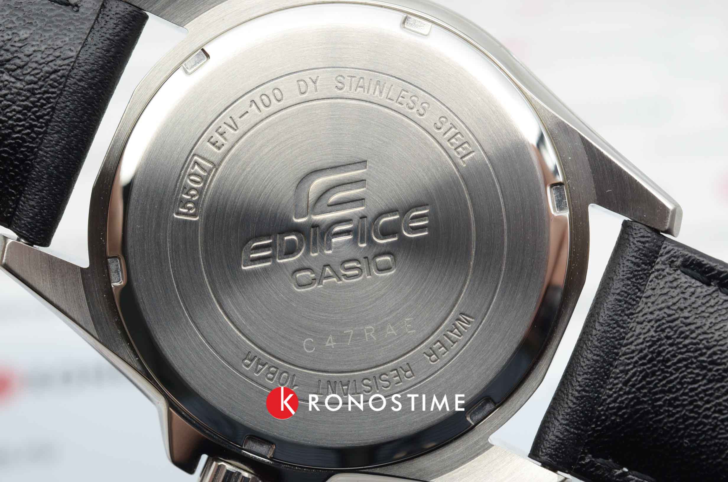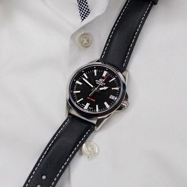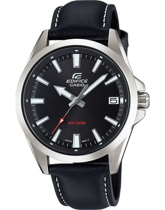 Японские мужские часы-хронографХронографФункция позволяет измерять отрезки времени с особой точностью: часы, минуты, секунды. Верным признаком хронографа является наличие на циферблате 3 дополнительных окошек-счётчиков. Casio Edifice EFV-100L-1A. Edifice — крупный хронограф из серии EFV-550 на ремешке из натуральной кожи в стальном корпусе с черным циферблатом и яркими красными деталями. Модель отличает внушительные размеры и спортивный автомобильный дизайн. Минеральное стеклоМинеральное стеклоМинеральное стекло представляет собой искусственно выращенный минерал кварца. Такое стекло отличается особой устойчивостью к повреждениям и царапинам. Уступает по некоторым качествам сапфировому стеклу. устойчивое к появлению царапин, обладающее высокой прозрачностью. Светодиодная автоподсветка NeobriteПодсветка NeobriteИспользование светонакопительных составов на основе сульфида цинка или алюмината стронция, яркий свет можно наблюдать на протяжении 6-10 часов после «зарядки» часов около источника света. - при повороте часов в сторону лица подсветка дисплея осуществляется автоматически. Настраиваемое послесвечение 1,5 или 3сек. СекундомерСекундомерСекундоме́р — прибор, способный измерять интервалы времени с точностью до долей секунды. с точностью измерения 1/100 секунды и измерением до 23 часов 59 минут 59,99 cек. Класс водозащиты: 100 метров, позволит плавать, нырять и заниматься другими водными видами спорта. Кожаный ремешок на стандартной застежке.