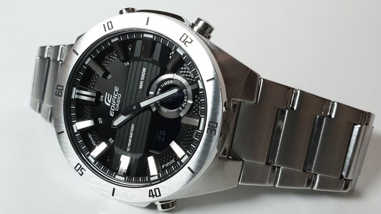 Аналого-цифровая модель привлекает внимание необычным дизайном тёмного циферблата крупной индикацией времени, общий стиль выражен в автомобильной тематике. Аксессуар станет прекрасным вариантом для спортивного стиля в одежде. Точность хода японского кварцевого механизма составляет +/- 30 сек/мес. Срок службы батарейки рассчитан на 10 лет. Минеральное стеклоМинеральное стеклоМинеральное стекло представляет собой искусственно выращенный минерал кварца. Такое стекло отличается особой устойчивостью к повреждениям и царапинам. Уступает по некоторым качествам сапфировому стеклу.. Габариты: 52 x 47,6 x 14,2 мм. Подсветка NeobriteПодсветка NeobriteИспользование светонакопительных составов на основе сульфида цинка или алюмината стронция, яркий свет можно наблюдать на протяжении 6-10 часов после «зарядки» часов около источника света. продолжает светиться в темноте даже после непродолжительного пребывания на свету. Записная книжка на 30 ячеек памяти для записи имен и телефонных номеров, каждая запись может включать в себя текст из 8 букв и 12 цифр. Мировое времяМировое время Полезное часовое усложнение, отображающее время в основных городах и известных областях по всему миру, оно связано с часовыми поясами, удобно для путешественников и бизнесменов. – 30 городов (29 часовых поясов), возможность включения/отключения летнего времени. 12-ти и 24-х часовой формат времени. СекундомерСекундомерСекундоме́р — прибор, способный измерять интервалы времени с точностью до долей секунды. с точностью показаний 1/100с и временем измерения 24ч. Сплит-хронографСплит-хронографИспользуется для измерения продолжительности нескольких временных отрезков, начинающихся одновременно, а заканчивающихся в разное время.. ТаймерТаймерОтсчитывает секунды в обратном направлении в заданном интервале времени. обратного отсчета от 1мин до 24ч. Батарея рассчитана на 10 лет. Стальной браслет на раскладной застёжкеРаскладная застёжкаТакой тип застёжки используется только на браслетах из металла. Она никогда не раскрывается полностью, происходит разделение на 2 и более частей. Раскладывающая застёжка снизит вероятность потери часов к минимуму..