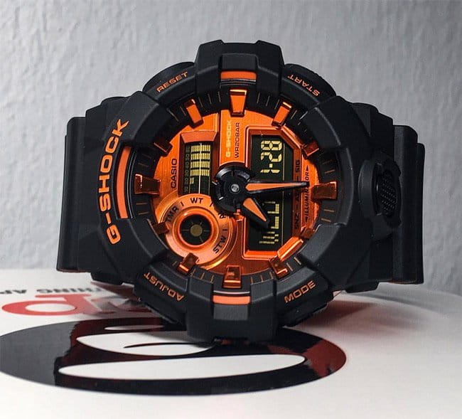 Компания Casio представляет новый яркий дизайн модели GA-700BR-1AER. Модельвыполнена в универсальном черном матовом цвете с яркими оранжевыми акцентами, такая цветовая гамма отлично сочетается как с уличным стилем одежды, так и с повседневным