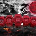 Как и в черной коллекции, выбор пал на недорогие и популярные корпуса. Особенностью подборки является красный цвет. Причем красное здесь абсолютно все — начиная от электронных дисплеев и стрелок, и заканчивая ремешком и часовыми отметками. За исключением кнопок и держателей ремешка. По заявлениям производителя, для окраски использовался совершенно новый технологический метод. Он заключается в покрытии материала мельчайшими частицами краски, смешанными с диффузным отражением света. Именно благодаря новой технологии достигается максимальный эффект матовой отделки