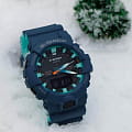 Брендовая модель с бирюзовыми деталями точно станет запоминающейся деталью вашего образа. Часы получили обновлённый дизайн и уменьшенный противоударный корпусУдаропрочный корпусМеханизм заключён в корпус, выполненный из современных материалов, устойчивых к ударам, механическим повреждениям и падению с высоты: инновационный пластик, карбон, нержавеющая сталь, титан., если сравнивать с моделями серии GA-700. Он выполнен из полимерного пластика, что гарантирует повышенную устойчивость к ударам, повреждениям, падению с высоты. Японский кварцевый калибр с точностью хода +/- 15 секунд в месяц. Срок службы батарейки - 3 года. Функция выключения и включения звука кнопок. Стрелки с люминесцентным покрытиемЛюминесцентное покрытиеПозволяет считывать показания времени в темноте. Производители наносят на стрелки, часовые индексы, безель или поверхность циферблата светонакопительный состав, дающий холодное свечение.. Двойная светодиодная подсветкаСветодиодная подсветкаСветодиодная или LED-подсветка обеспечивает появление яркого холодного свечения за счёт LED-элементов - маленьких лампочек. Они потребляют минимальное количество энергии, чаще всего можно встретить 1 светодиод, в нижней части циферблата.. Водозащита 20 бар. Минеральное стекло. Полимерный браслет. Секундомер, таймер обратного отсчёта, мировое времяМировое время Полезное часовое усложнение, отображающее время в основных городах и известных областях по всему миру, оно связано с часовыми поясами, удобно для путешественников и бизнесменов. , 5 ежедневных будильников, автоматический календарь. Габариты: 54,1 x 48,6 x 15,5 мм.