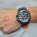 Флагманские G-SHOCK GPW-2000 в корпусе цвета хаки с темно-серым стальным безелем и ярко-оранжевой внутренней поверхностью ремешка. У данной модели 3 независимых вида синхронизации времени: GPS- и радио-синхронизация времени с атомными часами в разных частях света, а также синхронизация по Bluetooth с приложением G-Shock Connected на вашем смартфоне.
