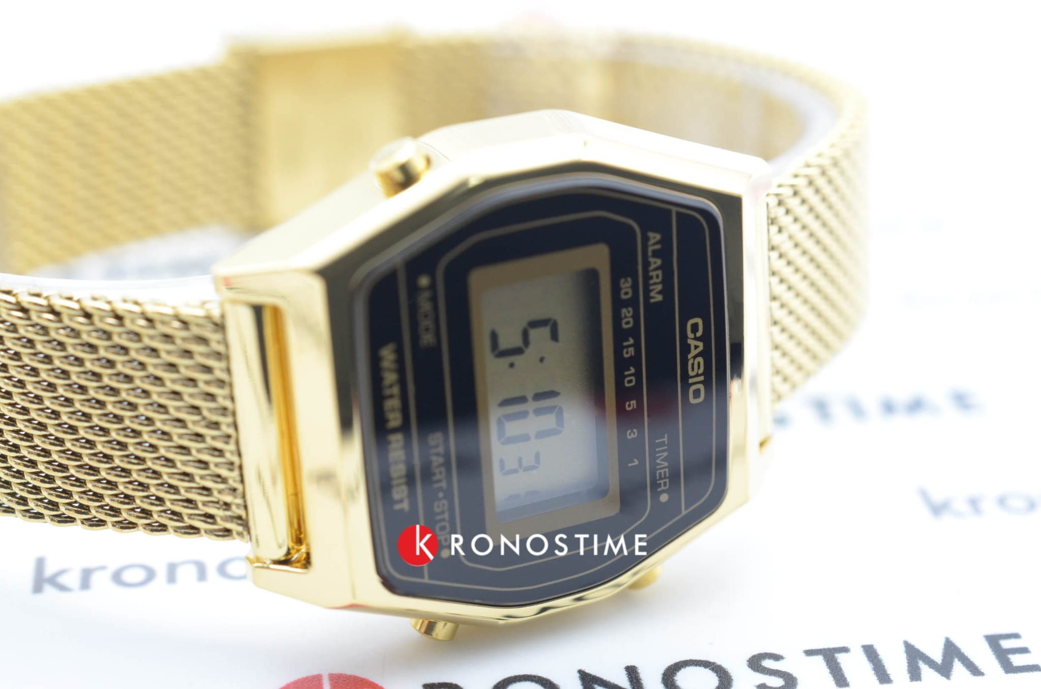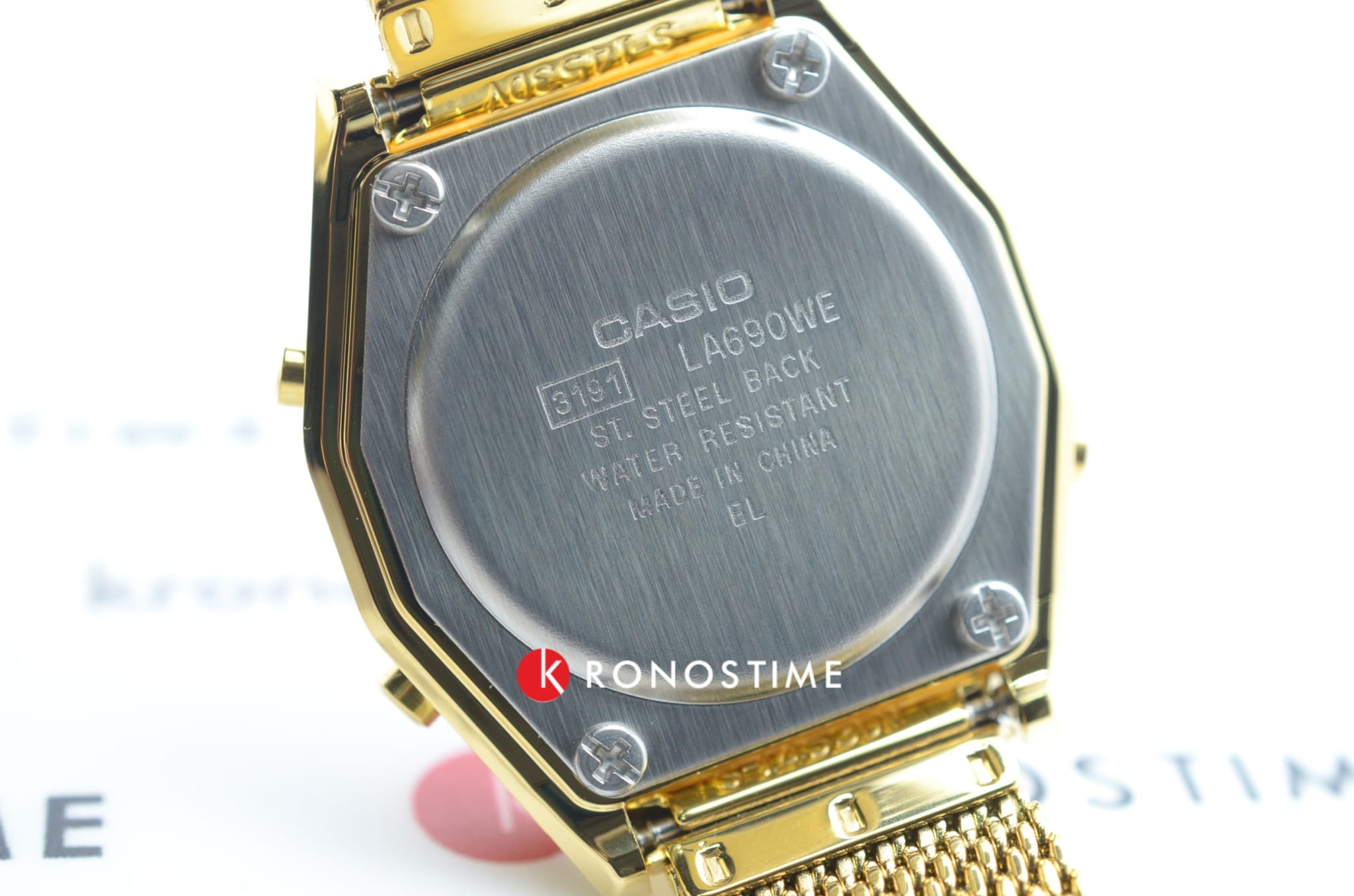 Casio Illuminator LA690WEMY-1EF корпус из полимерного пластика, браслет у часов из прочной нержавеющей стали, часы имеют кварцевый механизм, точность хода +/- 30 с/мес, стеклопластик (органическое) стекло, его практически невозможно разбить, зато довольно легко поцарапать, однако такие стёкла легко шлифуются.