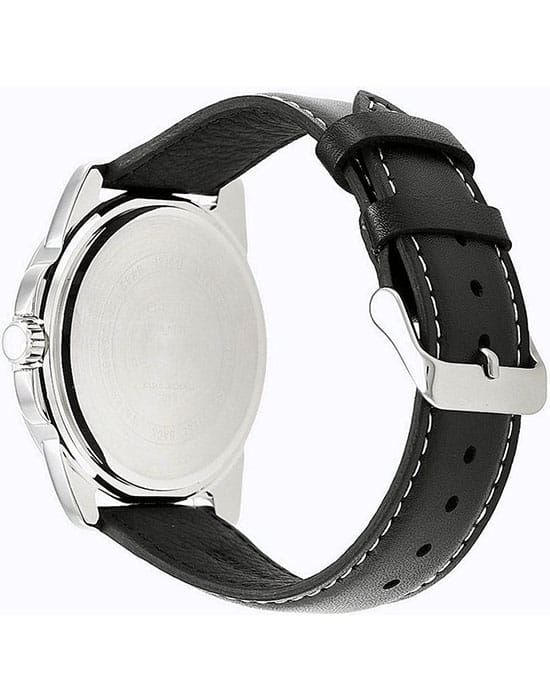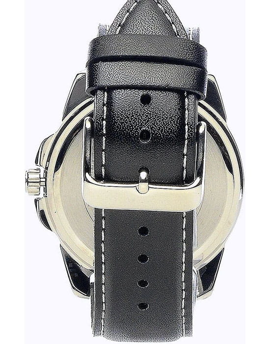 Тёмный циферблат с серебристыми часовыми метками и стрелками позволяет использовать часы в сочетании с одеждой любого цвета. Корпус из гипоаллергенной латуни отличается лёгкостью, чёрный ремешок из натуральной кожи надёжно обхватывает запястье. Срок службы батарейки для питания кварцевого механизма - 3 года. Люминесцентная подсветкаЛюминесцентное покрытиеПозволяет считывать показания времени в темноте. Производители наносят на стрелки, часовые индексы, безель или поверхность циферблата светонакопительный состав, дающий холодное свечение.. Сохранение водонепроницаемости при давлении до 5 бар. Минеральное стекло. Габариты: 44,9 x 50 x 9,4 мм.