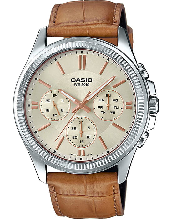 Мужские японские наручные часы из линейки MTP Collection умело сочетают в себе винтажные элементы и спортивный стиль, часы придутся по вкусу ценителям японского качества и лаконичности.