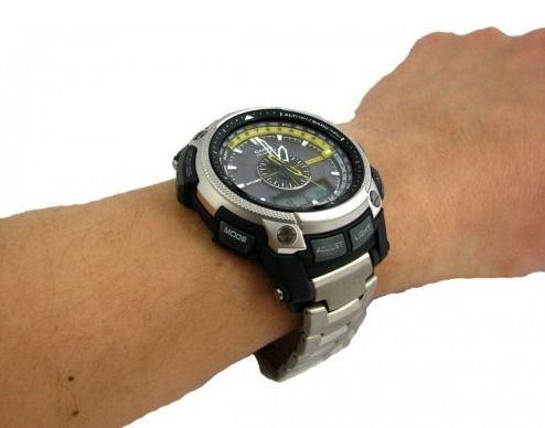 Многофункциональные часы с противоударной конструкцией и хорошей водозащитой. Часы работают на солнечных элементах. Cветодиодная подсветка автоматически включается при тусклом, темном свете и отключается при хорошем освещении. Часы рассчитаны на работу при температуре ниже нуля. В режиме "Мировое время" можно просмотреть местное время в некоторых основных городах и определенных регионах мира. В режиме Секундомера можно фиксировать отдельные отрезки времени с точностью показаний 1/100 сек и временем измерения 24 часа. Часы оснащены цифровым компасом, альтиметром, барометром, датчиком температуры. Альтиметр – датчик барометрического давления с выводом результата в единицах высоты над уровнем моря. Максимальная высота измерения – 10000 метров над уровнем моря. Индикатор уровня заряда элемента питания. Календарь автоматический: автоматически учитываются месяцы разной продолжительности и високосные годы. Габаритные размеры - 56,8х49,3х14,3. Вес 113г.