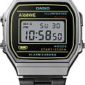 Casio A168WEHB-1A — это наручные часы в винтажном стиле, вдохновлённые дизайном карманного калькулятора SL-800 1983 года. Они сочетают ретро-эстетику с современными функциями. Размер корпуса: 38,6 × 36,3 × 9,6 мм Вес: 49 г Материал корпуса и безеля: с хромированным покрытием Браслет: нержавеющая сталь с регулируемой застёжкой Водонепроницаемость: WR 30 защита от брызг Питание: батарея CR2016 с ресурсом около 7 лет Стекло: пластиковое Подсветка: электролюминесцентнаяЭлектролюминесцентная подсветкаЭлектролюминесцентная панель устанавливается под ЖК-экраном часов, при нажатии кнопки электричество преобразуется в свет за счёт подачи напряжения на атомы фосфора, такой тип подсветки позволяет освещать весь циферблат. с синим цветом Функции: ежедневный будильник, почасовой сигнал, автоматический календарь, 12/24-часовой формат времени, секундомер с точностью 1/100 секунды и максимальным временем измерения 59'59.99" Эта модель идеально подойдёт для ценителей ретро-дизайна и функциональных аксессуаров.