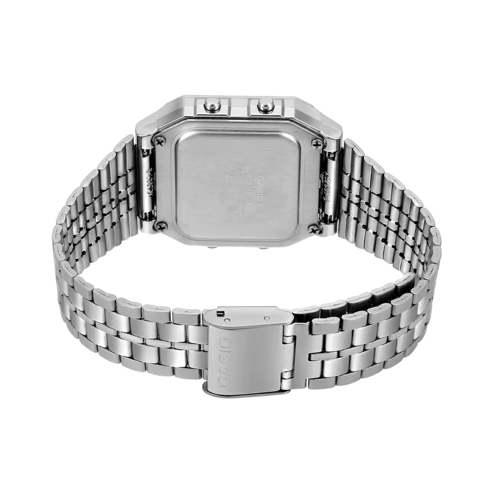 Японские мужские часы с хронографом Casio Vintage A500WA-1, кварцевый механизм с высокой точностью. Класс водозащиты: 30 метров, позволит защитить корпус от случайных брызг или капель дождя. Корпус часов изготовлен из пластика, серебристого цвета. Светодиодная подсветкаСветодиодная подсветкаСветодиодная или LED-подсветка обеспечивает появление яркого холодного свечения за счёт LED-элементов - маленьких лампочек. Они потребляют минимальное количество энергии, чаще всего можно встретить 1 светодиод, в нижней части циферблата. с настраиваемым временем свечения 1,5 или 3 сек. Индикация времени в 4 часовых поясах с отображением на схематической карте мира. Отображение мирового времени Мировое время Полезное часовое усложнение, отображающее время в основных городах и известных областях по всему миру, оно связано с часовыми поясами, удобно для путешественников и бизнесменов. в 31 часовом поясе с отображением 48 основных городов в этих зонах. СекундомерСекундомерСекундоме́р — прибор, способный измерять интервалы времени с точностью до долей секунды. с точностью измерений 1/100 сек., общее время измерений 24 часа. Таймер обратного отсчета на 24 часа. 5 ежедневных будильников и ежечасный сигнал. Автоматический календарь учитывает количество дней в месяцах, включая 28 в феврале. Отображение даты и дня недели и месяца. Формат времени 12/24-часовой. Дизайн корпуса соответствует современному универсальному стилю и имеет в оформлении элементы, напоминающие о первых электронных часах. Корпус из твердого и долговечного пластика.