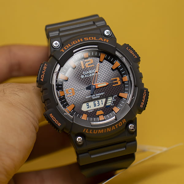 Многофункциональные и сдержанные часы в спортивном стиле станут идеальным выбором для современных мужчин. Analog-Digital Combination. LCD циферблат подсвечивается светодиодной подсветкойСветодиодная подсветкаСветодиодная или LED-подсветка обеспечивает появление яркого холодного свечения за счёт LED-элементов - маленьких лампочек. Они потребляют минимальное количество энергии, чаще всего можно встретить 1 светодиод, в нижней части циферблата.. Питание от солнечной энергии, индикатор заряда батареи. Функция автоматического сохранения энергии (отключает LCD дисплей). Время работы аккумулятора без подзарядки - 10 месяцев, при включенной функции сохранения энергии - 23 месяцев. CекундомерСекундомерСекундоме́р — прибор, способный измерять интервалы времени с точностью до долей секунды. с точностью показаний 1/100с и временем измерения 1ч. Два таймераТаймерОтсчитывает секунды в обратном направлении в заданном интервале времени. обратного отсчета времени от 5с до 100 мин с устанавливаемым количеством повторов от 1 до 10. Мировое времяМировое время Полезное часовое усложнение, отображающее время в основных городах и известных областях по всему миру, оно связано с часовыми поясами, удобно для путешественников и бизнесменов. . 12-ти и 24-х часовой формат времени. Шесть языков отображения дня недели: английский, португальский, испанский, французский, немецкий и итальянский. Функция включения/отключения звука. Класс водозащиты: 100 метров, позволит плавать, нырять и заниматься другими водными видами спорта. Пластиковый ремешок на стандартной застёжке.