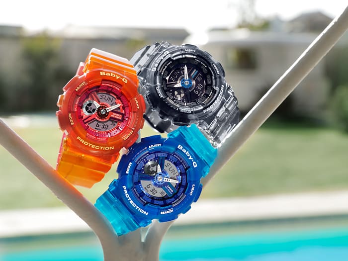 Противоударные японские женские часы Casio Baby-G BA-110JM-2A, кварцевый механизм с высокой точностью. Класс водозащиты: 100 метров, позволит плавать, нырять и заниматься другими водными видами спорта. Корпус часов изготовлен из пластика, прозрачного цвета.