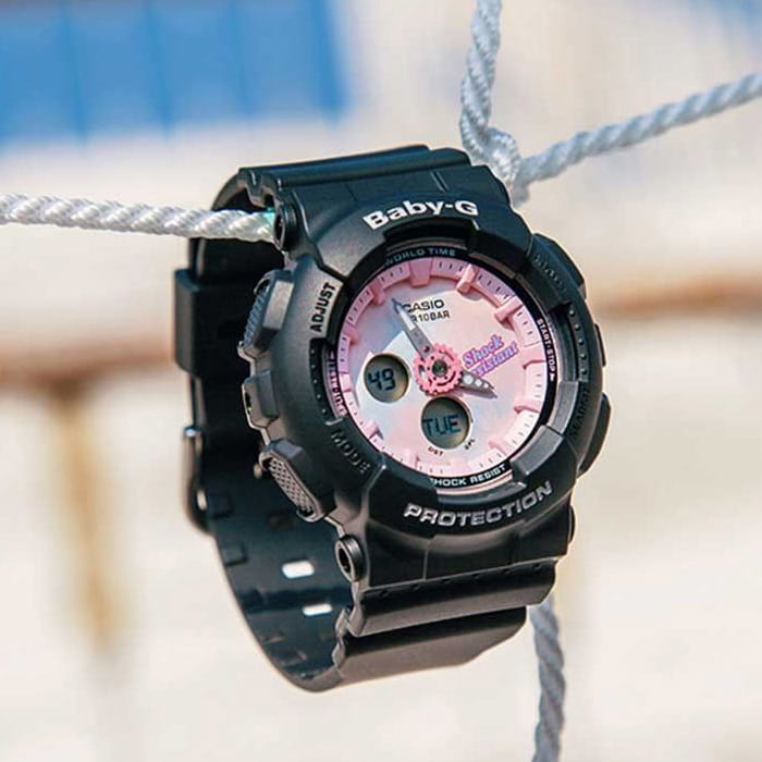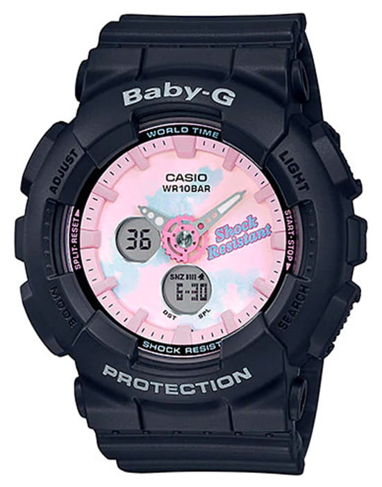 Женские противоударные японские наручные часы Casio Baby-G BA-120T-1A, кварцевый механизм с высокой точностью. Класс водозащиты: 100 метров, позволит плавать, нырять и заниматься другими водными видами спорта. Корпус часов изготовлен из пластика, цвета.