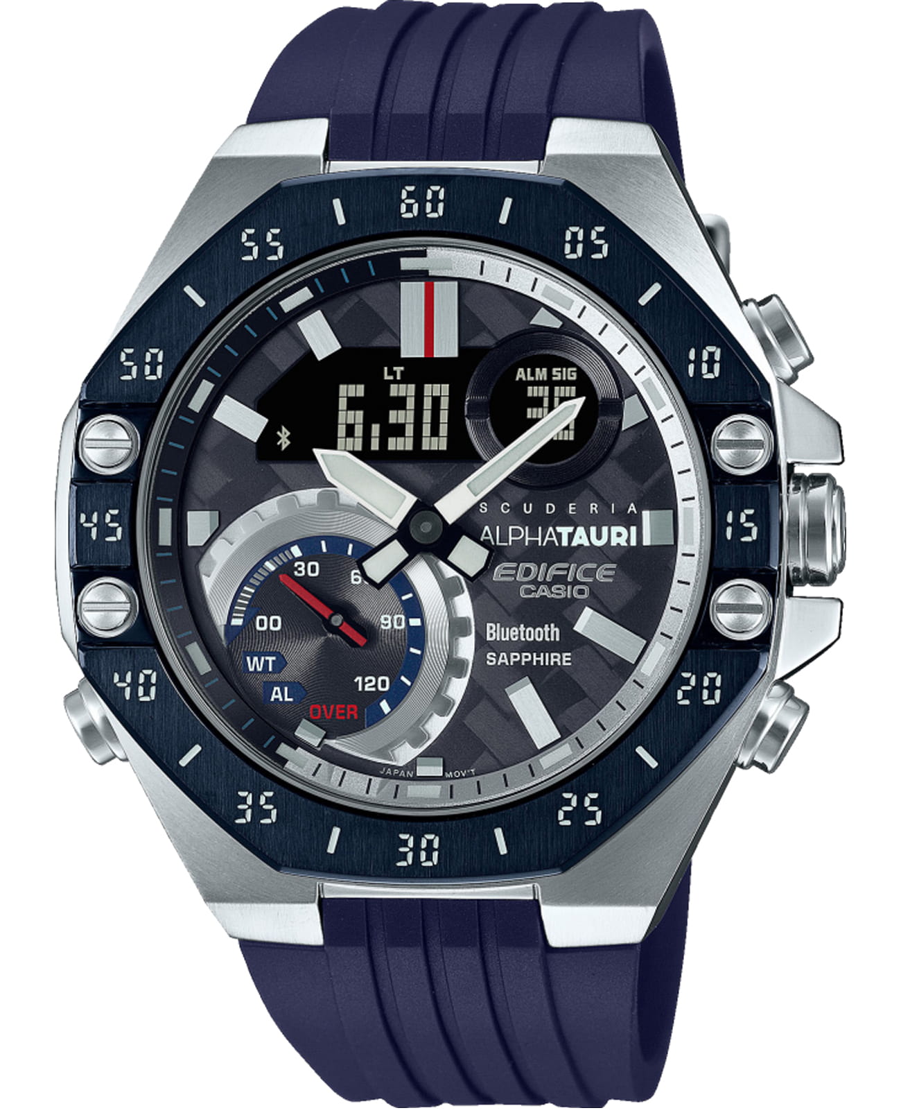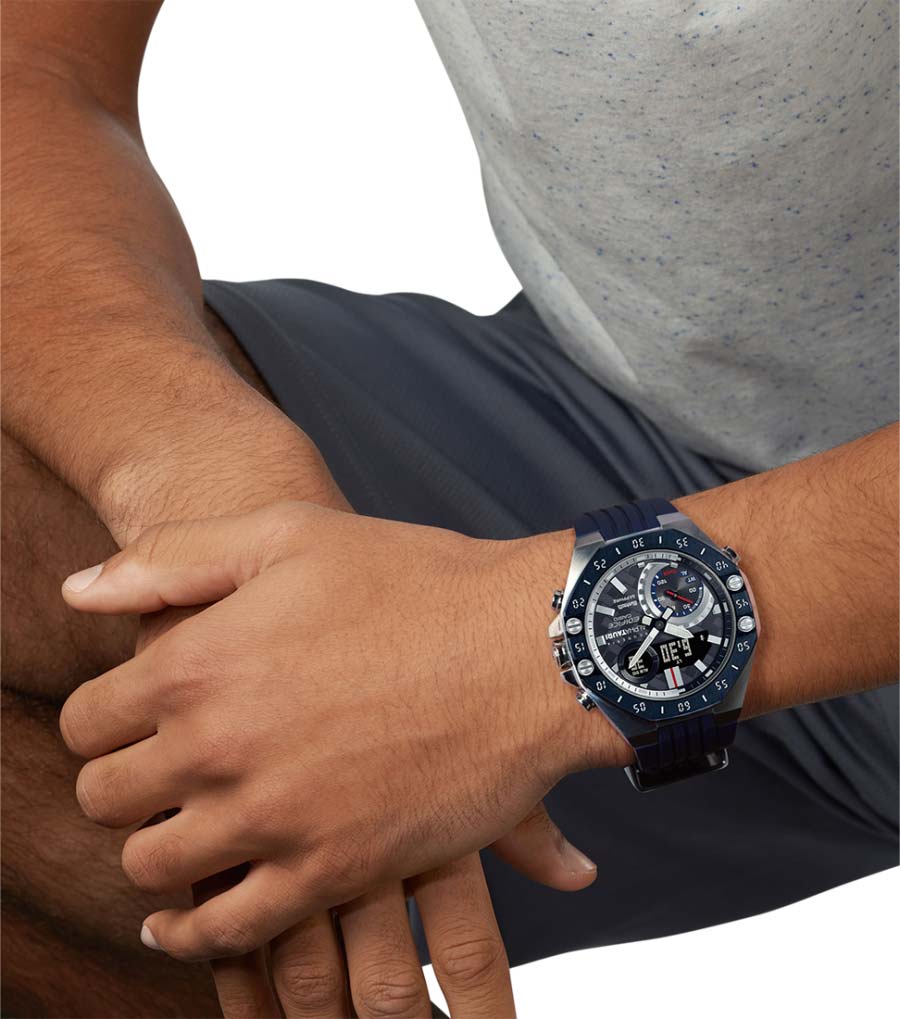 Casio Edifice ECB-10AT-1A – лимитированная модель, созданная в сотрудничестве с командой Формулы-1 Scuderia AlphaTauri. Корпус размером 48,5 мм и толщиной 12,5 мм выполнен из нержавеющей стали с IP-покрытиемIP-покрытиеМетод ионного напыления. Демонстрирует повышенную устойчивость к истиранию, окислению и химическим веществам. Под воздействием высокого давления и температуры около 1500°C молекулы металла надёжно соединяются с частицами корпуса часов. чёрного цвета, обеспечивающим прочность и устойчивость к коррозии. Циферблат выполнен из 6K карбона, что придаёт ему уникальный и технологичный вид, а его поверхность защищена сапфировым стекломСапфировое стеклоПрочный и надёжный материал из кристалла сапфира синтетического происхождения, характеризующийся особой твёрдостью и устойчивостью к царапинам и повреждениям. с антибликовым покрытиемАнтибликовое покрытиеСлой оксида металла в 0,13-0,3 микрон, благодаря которому стекло часов не бликует и не отражает свет. Антибликовое покрытие уменьшает отражение света в 10 раз, обеспечивая отличную читаемость показателей циферблата., устойчивым к царапинам.