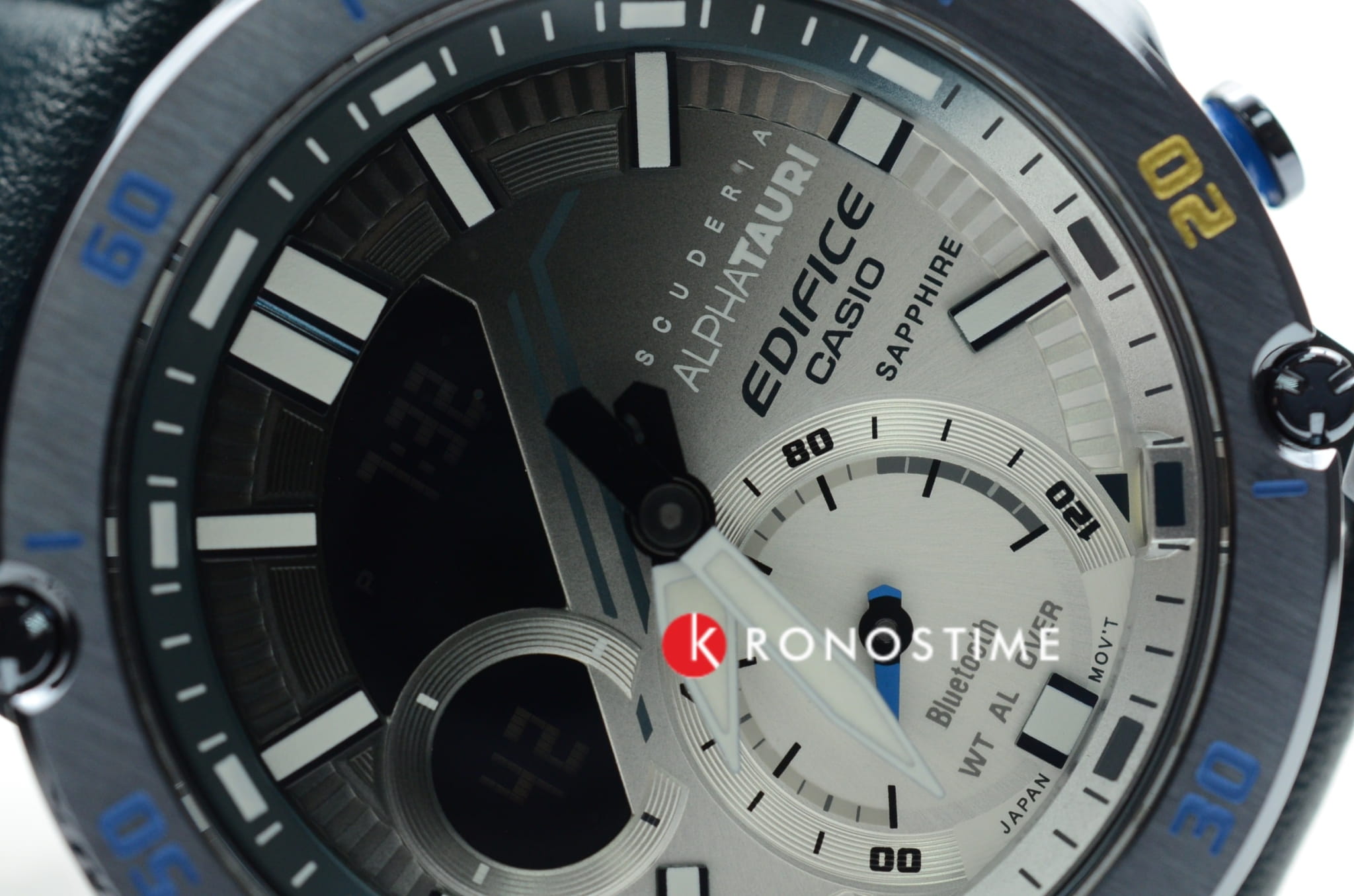 Модель является коллаборацией Casio Edifice и гоночной команды Формулы 1 Scuderia AlphaTauri. Брендированный ремешок выполнен из натуральной кожи. Сапфировое стекло дополнено антибликовым покрытиемАнтибликовое покрытиеСлой оксида металла в 0,13-0,3 микрон, благодаря которому стекло часов не бликует и не отражает свет. Антибликовое покрытие уменьшает отражение света в 10 раз, обеспечивая отличную читаемость показателей циферблата.. Точность хода японского кварцевого механизма составляет +/- 15 секунд в месяц. Заводная головка имеет защиту. Корпус изготовлен из антикоррозионной стали 316L с IP-покрытиемIP-покрытиеМетод ионного напыления. Демонстрирует повышенную устойчивость к истиранию, окислению и химическим веществам. Под воздействием высокого давления и температуры около 1500°C молекулы металла надёжно соединяются с частицами корпуса часов.. Функции: хронографХронографФункция позволяет измерять отрезки времени с особой точностью: часы, минуты, секунды. Верным признаком хронографа является наличие на циферблате 3 дополнительных окошек-счётчиков., будильник, мировое времяМировое время Полезное часовое усложнение, отображающее время в основных городах и известных областях по всему миру, оно связано с часовыми поясами, удобно для путешественников и бизнесменов. , секундомер, BluetoothBluetoothСовременная технология, позволяющая синхронизировать часы с телефоном и переносить данные. Часы с Bluetooth расширяют возможности вашего смартфона и делают его использование ещё более удобным., автоматический календарь, UTCUTCВсемирное кординационное время, не имеющее привязки к географическому положению Гринвича, основывается на атомном отсчёте времени. Регулировка времени осуществляется более точно, чем устаревшее GMT.