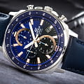 Градиентный циферблат защищён минеральным стекломМинеральное стеклоМинеральное стекло представляет собой искусственно выращенный минерал кварца. Такое стекло отличается особой устойчивостью к повреждениям и царапинам. Уступает по некоторым качествам сапфировому стеклу.. Японский кварцевый механизм отличается высокой точностью хода 20 +/- секунд в месяц. Ремешок изготовлен из натуральной кожи. Завинчивающаяся задняя крышка усиливает водостойкость в 10 бар. Стрелки дополнены люминесцентной подсветкойЛюминесцентное покрытиеПозволяет считывать показания времени в темноте. Производители наносят на стрелки, часовые индексы, безель или поверхность циферблата светонакопительный состав, дающий холодное свечение.. Подсветка NeobriteПодсветка NeobriteИспользование светонакопительных составов на основе сульфида цинка или алюмината стронция, яркий свет можно наблюдать на протяжении 6-10 часов после «зарядки» часов около источника света. обеспечивает длительное послесвечение в темноте даже после кратковременного нахождения на свету. Часы-хронографХронографФункция позволяет измерять отрезки времени с особой точностью: часы, минуты, секунды. Верным признаком хронографа является наличие на циферблате 3 дополнительных окошек-счётчиков. с секундомеромСекундомерСекундоме́р — прибор, способный измерять интервалы времени с точностью до долей секунды. с точностью показаний 1/10с и временем измерения 1ч. Циферблат с окошком даты. Заводная головка с защитой. Задняя крышка с винтовым фиксатором. Кожаный ремешок с классической застежкой.