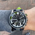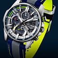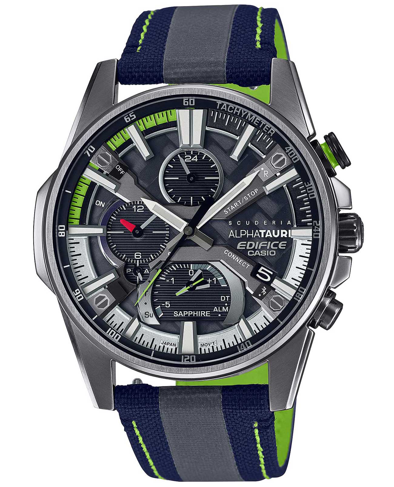 Флагманская модель в коллекции Edifice несомненно идеально будет смотреться на сильном мужском запястье. Часы Casio Edifice Scuderia Alpha Tauri EFS-S580AT-1AER из лимитированной серии, созданной в коллаборации с итальянской гоночной командой Формулы-1 Scuderia AlphaTauri. Внутренний корпус часов изготовлен из того же углеродного волокна 6K, что используется в аэродинамических крыльях гоночной машины Scuderia AlphaTauri. Элементы циферблата и секундная стрелка окрашены в флуоресцентный желтый цвет, который используется на трассах Формулы-1 для безопасности. Тканевый ремешок со светоотражающей полоской и классической застежкой. В комплекте сменный кожаный ремешок. Лимитированная серия. Часы созданы при сотрудничестве с гоночной командой Scuderia AlphaTauri Formula 1, которую поддерживает EDIFICE. Циферблат и застежка украшены логотипом команды. Карбон 6K используемый для изготовления циферблата точно такой же, который используется при создании болида команды Scuderia AlphaTauri. Флуоресцентный желтый цвет - цвет, который используется на гоночной трассе для безопасности, а последние 15 секунд подсвечиваются в соответствии с правилом F1, согласно которому члены экипажа должны покинуть сетку за 15 секунд до начала гонки. Питание от солнечной энергии Tough SolarTough SolarТехнология основана на подзарядке аккумулятора от источника солнечного света, специальная панель улавливает солнечные лучи и преобразует их в энергию для работы часов. Достаточно пары минут нахождения на солнце для функционирования часов в течении суток. - солнечные батарейки большой мощности, индикатор низкого заряда батареи. Время работы аккумулятора без подзарядки до 5 месяцев, при включенной функции сохранения энергии до 19 месяцев. Подсветка NeobriteПодсветка NeobriteИспользование светонакопительных составов на основе сульфида цинка или алюмината стронция, яркий свет можно наблюдать на протяжении 6-10 часов после «зарядки» часов около источника света. обеспечивает длительное послесвечение в темноте даже после кратковременного нахождения на свету. Часы-хронографХронографФункция позволяет измерять отрезки времени с особой точностью: часы, минуты, секунды. Верным признаком хронографа является наличие на циферблате 3 дополнительных окошек-счётчиков. с секундомеромСекундомерСекундоме́р — прибор, способный измерять интервалы времени с точностью до долей секунды. и тахиметромТахиметрРазмеченная шкала, располагается на ободке или безеле часов. Тахиметр позволяет рассчитать скорость на определённом участке пути, расстояние измеряется в километрах или милях.. СекундомерСекундомерСекундоме́р — прибор, способный измерять интервалы времени с точностью до долей секунды. с точностью показаний 1/1000с и временем измерения 24ч. Память на 200 кругов. 12-ти и 24-х часовой формат времени. Второй часовой поясВторой часовой поясФункция, позволяющая отображать время двух часовых поясов одновременно. и мировое времяМировое время Полезное часовое усложнение, отображающее время в основных городах и известных областях по всему миру, оно связано с часовыми поясами, удобно для путешественников и бизнесменов. , одновременное отображение текущего времени и времени в другом часовом поясе. Беспроводная технология BluetoothBluetoothСовременная технология, позволяющая синхронизировать часы с телефоном и переносить данные. Часы с Bluetooth расширяют возможности 