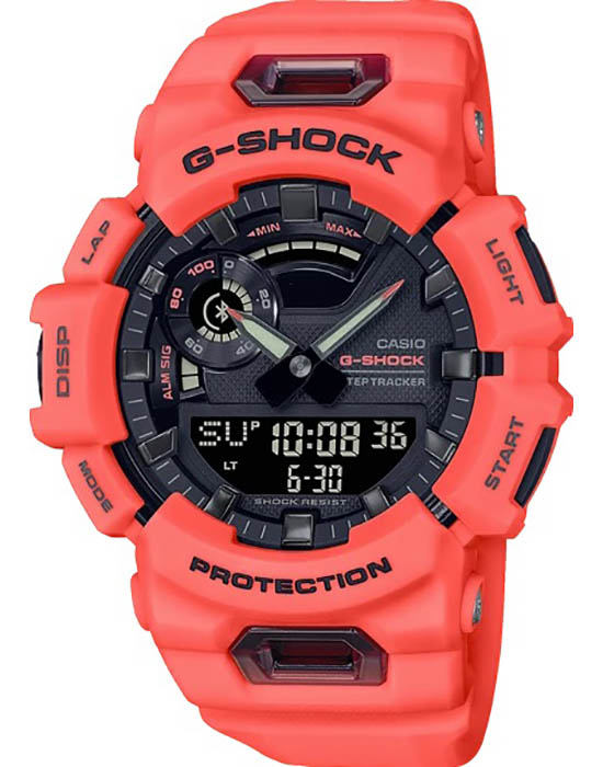 Японские мужские противоударные часы с шагомером Casio G-Shock GBA-900-4ADR (GBA-900-4A), электронный механизм с высокой точностью. Класс водозащиты: 200 метров, позволит плавать, нырять и заниматься другими водными видами спорта. Корпус часов изготовлен из пластика, цвета.