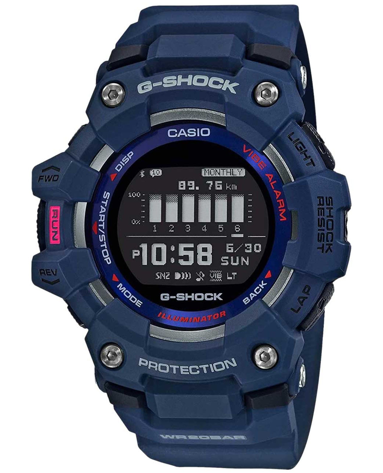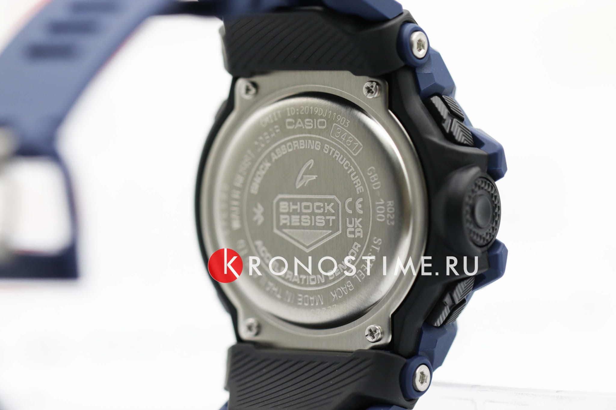 Японские мужские ударопрочные часы c функцией Bluetooth и шагомером Casio G-Shock GBD-100-2, кварцевый механизм с высокой точностью. Класс водозащиты: 200 метров, позволит плавать, нырять и заниматься другими водными видами спорта. Корпус часов изготовлен из пластика синего цвета. Ударопрочный корпусУдаропрочный корпусМеханизм заключён в корпус, выполненный из современных материалов, устойчивых к ударам, механическим повреждениям и падению с высоты: инновационный пластик, карбон, нержавеющая сталь, титан. защищает механизм от ударов и вибрации. Cветодиодная подсветкаСветодиодная подсветкаСветодиодная или LED-подсветка обеспечивает появление яркого холодного свечения за счёт LED-элементов - маленьких лампочек. Они потребляют минимальное количество энергии, чаще всего можно встретить 1 светодиод, в нижней части циферблата. с выбираемой длительностью свечения 1,5 или 3 секунды. Часы обладают шагомером и функцией BluetoothBluetoothСовременная технология, позволяющая синхронизировать часы с телефоном и переносить данные. Часы с Bluetooth расширяют возможности вашего смартфона и делают его использование ещё более удобным.. Bluetooth позволяет удобно отображать все метрики с часов на экране смартфона, а также выводить на часы уведомления о входящих звонках, сообщениях и имейлах. Базовые функции: сплит-хронографСплит-хронографИспользуется для измерения продолжительности нескольких временных отрезков, начинающихся одновременно, а заканчивающихся в разное время., секундомерСекундомерСекундоме́р — прибор, способный измерять интервалы времени с точностью до долей секунды., таймер и мировое времяМировое время Полезное часовое усложнение, отображающее время в основных городах и известных областях по всему миру, оно связано с часовыми поясами, удобно для путешественников и бизнесменов. . Модель оснащена показателем всемирного координированного времени UTCUTCВсемирное кординационное время, не имеющее привязки к географическому положению Гринвича, основывается на атомном отсчёте времени. Регулировка времени осуществляется более точно, чем устаревшее GMT.