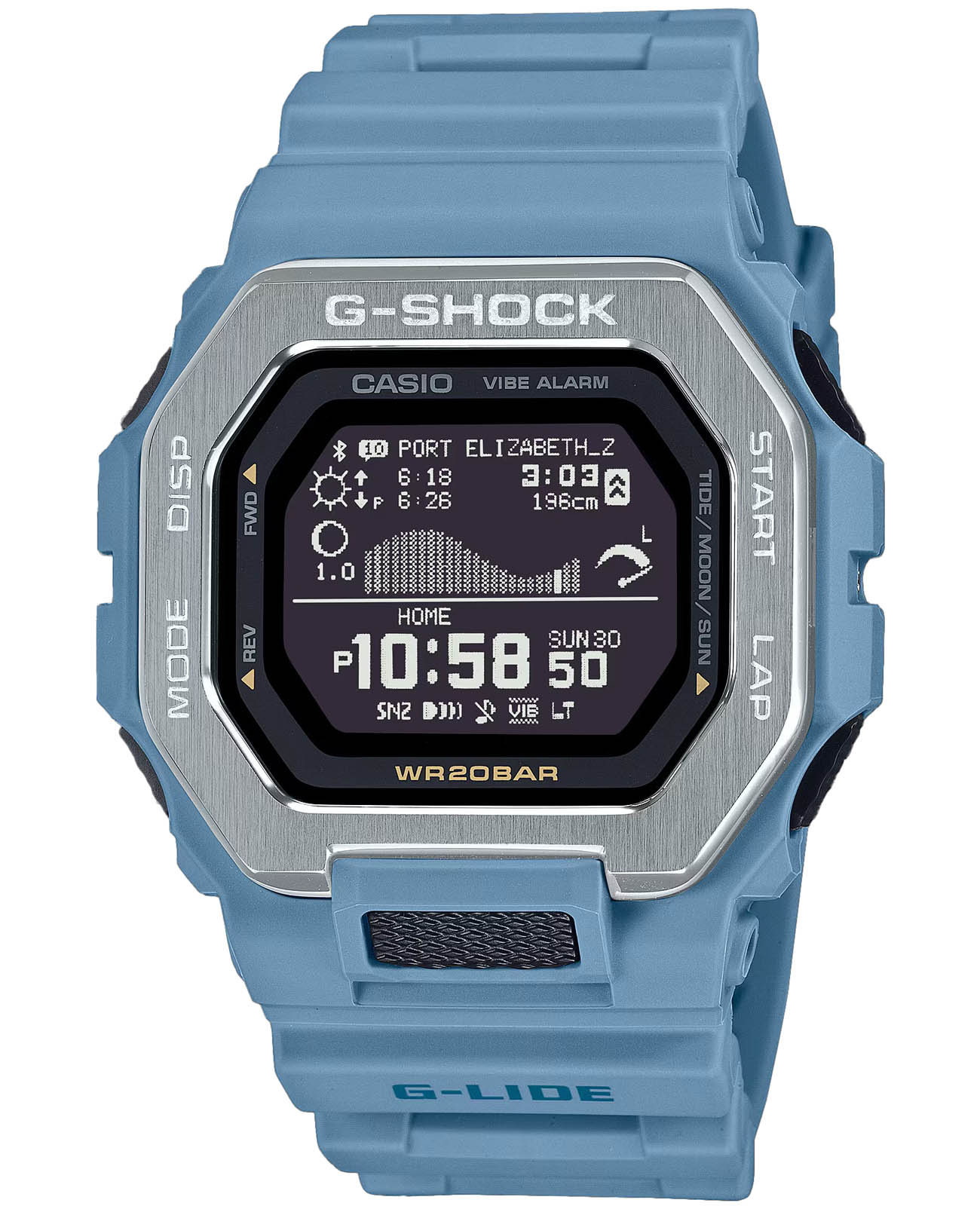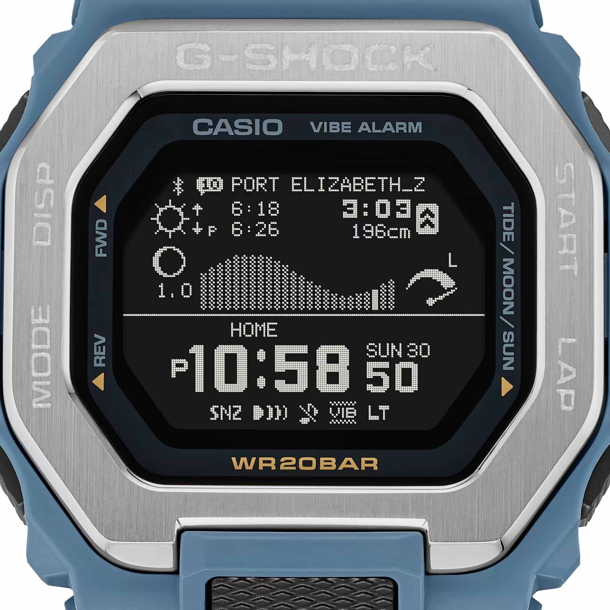 Японские мужские ударопрочные часы c функцией Bluetooth Casio G-Shock GBX-100-2A, кварцевый механизм с высокой точностью. Класс водозащиты: 200 метров, позволит плавать, нырять и заниматься другими водными видами спорта. Корпус представляет собой сочетание полимера и металла, причем безельБезельВнешний ободок, закрепляющий стекло. В спортивных часах так называется поворотное кольцо с делениями на циферблате, выполняет роль таймера – замеряет отрезки времени на шкале. Неподвижный безель – элемент декора. Однонаправленно вращающийся безель на дайверских часах позволяет фиксировать моменты погружения и выныривания на поверхность. выполнен из нержавеющей стали с блестящей шершавой обработкой для достижения прочности и текстуры. Ударопрочный корпусУдаропрочный корпусМеханизм заключён в корпус, выполненный из современных материалов, устойчивых к ударам, механическим повреждениям и падению с высоты: инновационный пластик, карбон, нержавеющая сталь, титан. защищает механизм от ударов и вибрации. Долговечный и экономичный матричный дисплей MIP LCD высокой четкости улучшает читаемость и восприятие любых данных. Отображаемые графики приливов и отливов, данные о Луне, время и уровень прилива/отлива, время восхода/заката солнца. Фирменная экономичная светодиодная подсветкаСветодиодная подсветкаСветодиодная или LED-подсветка обеспечивает появление яркого холодного свечения за счёт LED-элементов - маленьких лампочек. Они потребляют минимальное количество энергии, чаще всего можно встретить 1 светодиод, в нижней части циферблата. Super Illuminator с функцией Afterglow. Базовые функции: 12-ти и 24-х часовой формат времени, секундомерСекундомерСекундоме́р — прибор, способный измерять интервалы времени с точностью до долей секунды. с точностью показаний 1 сек и временем измерения 100 ч, сплит-хронографСплит-хронографИспользуется для измерения продолжительности нескольких временных отрезков, начинающихся одновременно, а заканчивающихся в разное время., возможность установить 5 таймеров, таймер обратного отсчета от 1 сек до 1 ч с автоповтором, мировое времяМировое время Полезное часовое усложнение, отображающее время в основных городах и известных областях по всему миру, оно связано с часовыми поясами, удобно для путешественников и бизнесменов. – 38 городов (38 часовых поясов), всемирное координированное время (UTCUTCВсемирное кординационное время, не имеющее привязки к географическому положению Гринвича, основывается на атомном отсчёте времени. Регулировка времени осуществляется более точно, чем устаревшее GMT.