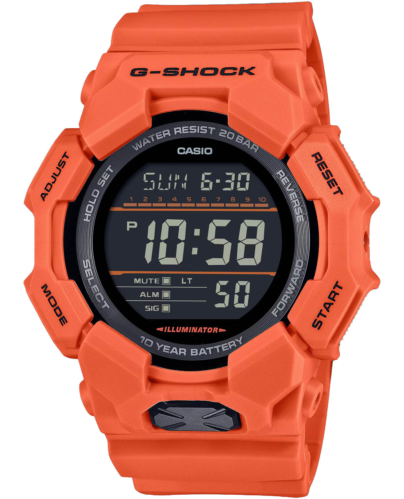 Стильные ударопрочные наручные кварцевые мужские часы Casio G-Shock GD-010-4. Корпус часов выполнен из пластика и карбона. Минеральное стеклоМинеральное стеклоМинеральное стекло представляет собой искусственно выращенный минерал кварца. Такое стекло отличается особой устойчивостью к повреждениям и царапинам. Уступает по некоторым качествам сапфировому стеклу. устойчиво к появлению царапин. Часы надежно удерживаются на руке ремешком из высокопрочного полимерного пластика оранжевого цвета. Класс водозащиты: 200 метров, позволит плавать, нырять и заниматься другими водными видами спорта. Из дополнительных функций в часах присутствует: вечный календарьВечный календарьКлассическое часовое усложнение, представляющее собой календарь, рассчитанный на несколько лет вперёд (стандартно – до 2099 года). Определяет текущую дату, день недели, месяц., секундомерСекундомерСекундоме́р — прибор, способный измерять интервалы времени с точностью до долей секунды., таймер обратного отсчета, второй часовой поясВторой часовой поясФункция, позволяющая отображать время двух часовых поясов одновременно., будильникБудильникБуди́льник — часы, в заданный момент времени подающие звуковой, световой и/или в редких случаях другой сигнал. (количество установок: 5), ежечасный сигнал, автоподсветка.