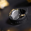 Наручные часы выполнены в облике моделей 80-х годов. 3 окошка Triple Graph разного размера расположились в верхней части золотистого циферблата, в нижней – цифровой дисплей. Противоударный корпусУдаропрочный корпусМеханизм заключён в корпус, выполненный из современных материалов, устойчивых к ударам, механическим повреждениям и падению с высоты: инновационный пластик, карбон, нержавеющая сталь, титан. сделан из сочетания пластика и карбоновых волокон, он защищён стальной полированной накладкой с износоустойчивым IP-покрытиемIP-покрытиеМетод ионного напыления. Демонстрирует повышенную устойчивость к истиранию, окислению и химическим веществам. Под воздействием высокого давления и температуры около 1500°C молекулы металла надёжно соединяются с частицами корпуса часов.. Комфортный ремешок изготовлен из тёмного полимера. Японский кварцевый механизм. Эксплуатационный срок батарейки – 2 года. Минеральное стекло. Электролюминесцентная подсветкаЭлектролюминесцентная подсветкаЭлектролюминесцентная панель устанавливается под ЖК-экраном часов, при нажатии кнопки электричество преобразуется в свет за счёт подачи напряжения на атомы фосфора, такой тип подсветки позволяет освещать весь циферблат. сине-зелёного оттенка. Водостойкость 200 метров. Световая индикация сигнала. Секундомер, многофункциональный будильник, таймер, хронографХронографФункция позволяет измерять отрезки времени с особой точностью: часы, минуты, секунды. Верным признаком хронографа является наличие на циферблате 3 дополнительных окошек-счётчиков., автокалендарь. Габариты: 49,7 x 53,9 x 18,6 мм.