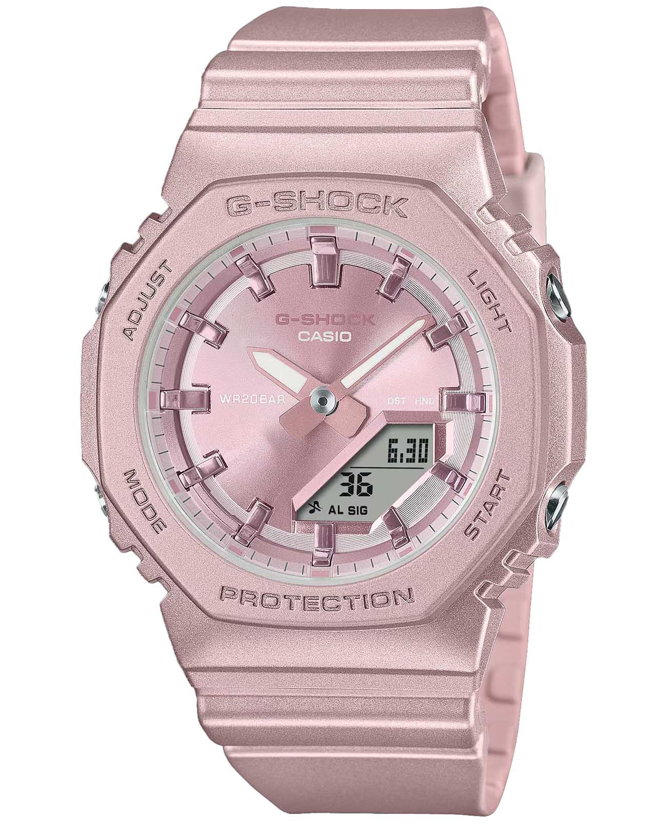 Женские кварцевые часы Casio G-Shock GMA-P2100ST-4A. Корпус часов изготовлен из пластика. Стрелки с люминесцентным покрытиемЛюминесцентное покрытиеПозволяет считывать показания времени в темноте. Производители наносят на стрелки, часовые индексы, безель или поверхность циферблата светонакопительный состав, дающий холодное свечение.. Водозащита: 200 метров, позволит плавать, нырять и заниматься другими водными видами спорта. Минеральное стеклоМинеральное стеклоМинеральное стекло представляет собой искусственно выращенный минерал кварца. Такое стекло отличается особой устойчивостью к повреждениям и царапинам. Уступает по некоторым качествам сапфировому стеклу. устойчивое к появлению царапин, обладающее высокой прозрачностью.