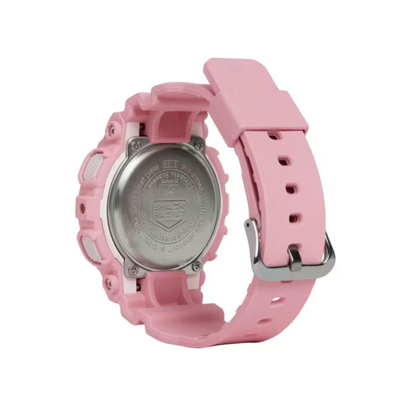 Японские женские часы GMA-S120NP-4A из коллекции G-Shock представлены в спортивном облачении. Кварцевые часы. Аналогово-цифровой циферблат. Наручные часы с противоударным корпусомУдаропрочный корпусМеханизм заключён в корпус, выполненный из современных материалов, устойчивых к ударам, механическим повреждениям и падению с высоты: инновационный пластик, карбон, нержавеющая сталь, титан. выполнены из полимерного материала, легко поглощающего силу удара и вибрации, что делает их надёжным и долговечным аксессуаром. Кварцевый механизм японского производства. Батарейка рассчитана на 3 года службы. Стрелки со светодиодной подсветкойСветодиодная подсветкаСветодиодная или LED-подсветка обеспечивает появление яркого холодного свечения за счёт LED-элементов - маленьких лампочек. Они потребляют минимальное количество энергии, чаще всего можно встретить 1 светодиод, в нижней части циферблата.. Минеральное стеклоМинеральное стеклоМинеральное стекло представляет собой искусственно выращенный минерал кварца. Такое стекло отличается особой устойчивостью к повреждениям и царапинам. Уступает по некоторым качествам сапфировому стеклу.. Защита от магнитных полей. Водонепроницаемость 200 метров, позволит плавать, нырять и заниматься другими водными видами спорта. Функциональные возможности: мировое времяМировое время Полезное часовое усложнение, отображающее время в основных городах и известных областях по всему миру, оно связано с часовыми поясами, удобно для путешественников и бизнесменов. , таймерТаймерОтсчитывает секунды в обратном направлении в заданном интервале времени. обратного отсчёта, будильникБудильникБуди́льник — часы, в заданный момент времени подающие звуковой, световой и/или в редких случаях другой сигнал., хронографХронографФункция позволяет измерять отрезки времени с особой точностью: часы, минуты, секунды. Верным признаком хронографа является наличие на циферблате 3 дополнительных окошек-счётчиков., автоматический календарь до 2099 года, UTCUTCВсемирное кординационное время, не имеющее привязки к географическому положению Гринвича, основывается на атомном отсчёте времени. Регулировка времени осуществляется более точно, чем устаревшее GMT.