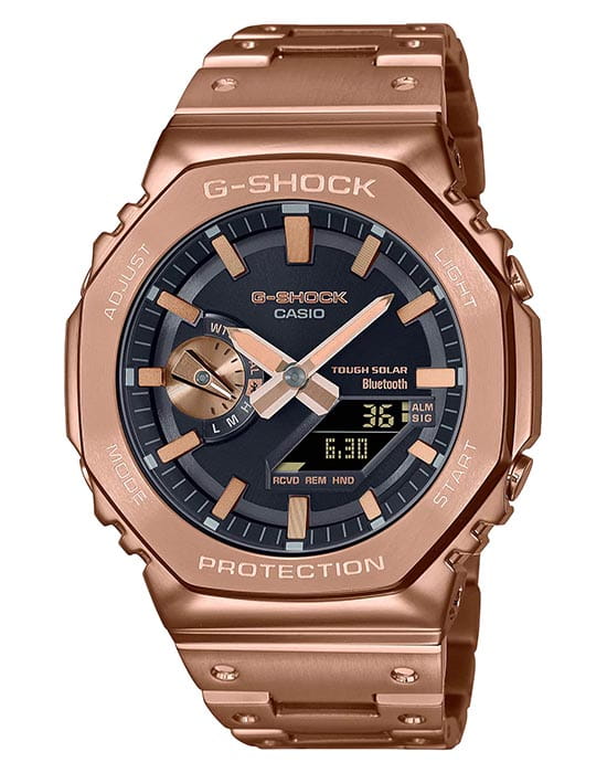 Японские мужские часы-хронографХронографФункция позволяет измерять отрезки времени с особой точностью: часы, минуты, секунды. Верным признаком хронографа является наличие на циферблате 3 дополнительных окошек-счётчиков. Casio G-Shock GM-B2100GD-5ADR. Стильный дизайн этих часов идеально дополняет функциональность и надежность. Часы для активной молодежи G-Shock. Стальной корпус с IP-покрытиемIP-покрытиеМетод ионного напыления. Демонстрирует повышенную устойчивость к истиранию, окислению и химическим веществам. Под воздействием высокого давления и температуры около 1500°C молекулы металла надёжно соединяются с частицами корпуса часов.. Питание от солнечной энергии Tough SolarTough SolarТехнология основана на подзарядке аккумулятора от источника солнечного света, специальная панель улавливает солнечные лучи и преобразует их в энергию для работы часов. Достаточно пары минут нахождения на солнце для функционирования часов в течении суток. - солнечные батарейки большой мощности. Индикатор заряда батареи. Функция автоматического сохранения энергии. Время работы аккумулятора без подзарядки - 7 месяцев, при включенной функции сохранения энергии - 18 месяцев. Минеральное стеклоМинеральное стеклоМинеральное стекло представляет собой искусственно выращенный минерал кварца. Такое стекло отличается особой устойчивостью к повреждениям и царапинам. Уступает по некоторым качествам сапфировому стеклу. устойчивое к появлению царапин, обладающее высокой прозрачностью. Ударопрочный корпусУдаропрочный корпусМеханизм заключён в корпус, выполненный из современных материалов, устойчивых к ударам, механическим повреждениям и падению с высоты: инновационный пластик, карбон, нержавеющая сталь, титан. защищает механизм от ударов и вибрации. Светодиодная автоподсветка NeobriteПодсветка NeobriteИспользование светонакопительных составов на основе сульфида цинка или алюмината стронция, яркий свет можно наблюдать на протяжении 6-10 часов после «зарядки» часов около источника света. - при повороте часов в сторону лица подсветка дисплея осуществляется автоматически. Настраиваемое послесвечение 1,5 или 3сек. Мировое время Мировое время Полезное часовое усложнение, отображающее время в основных городах и известных областях по всему миру, оно связано с часовыми поясами, удобно для путешественников и бизнесменов. 38 городов (38 часовых поясов), всемирное координированное время UTCUTCВсемирное кординационное время, не имеющее привязки к географическому положению Гринвича, основывается на атомном отсчёте времени. Регулировка времени осуществляется более точно, чем устаревшее GMT.