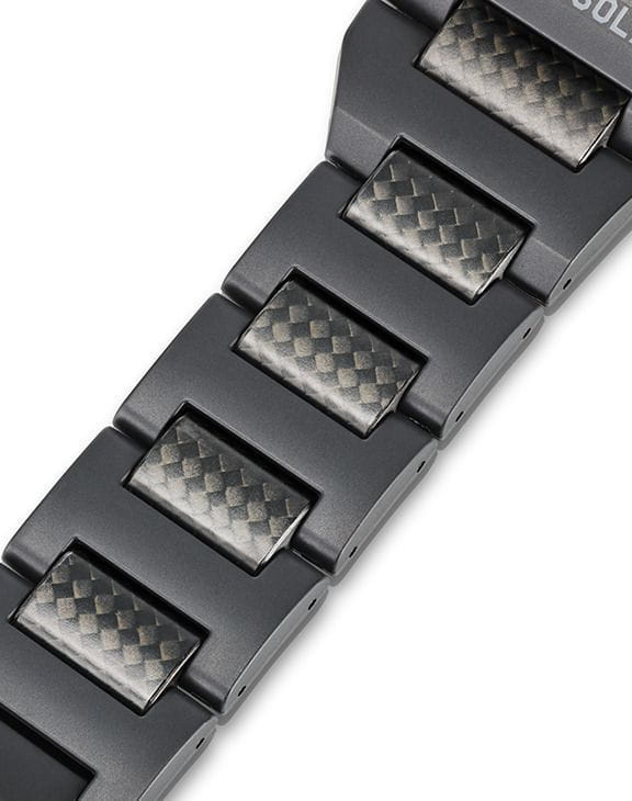 Монолитный карбоновый корпус. Выпуклое сапфировое стекло с антибликовым покрытием. Ремешок часов из армированной углеродом смолы с механизмом удлинения на пряжке для ношения часов поверх гидрокостюма во время погружения.